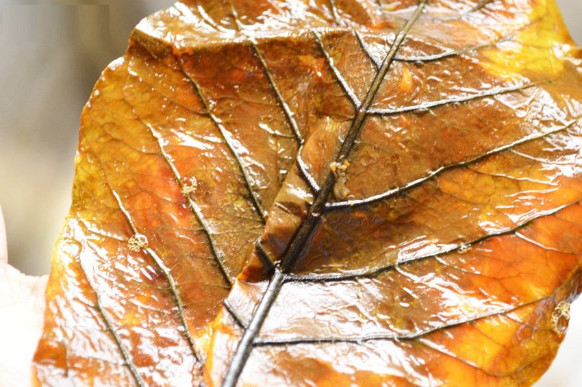 Las hojas ya secas se colocan sobre la tela y se golpean con un cepillo rígido (cerdas). Las partes frágiles se desmoronarán fácilmente con migajas, y las venas más duraderas permanecerán en su lugar.