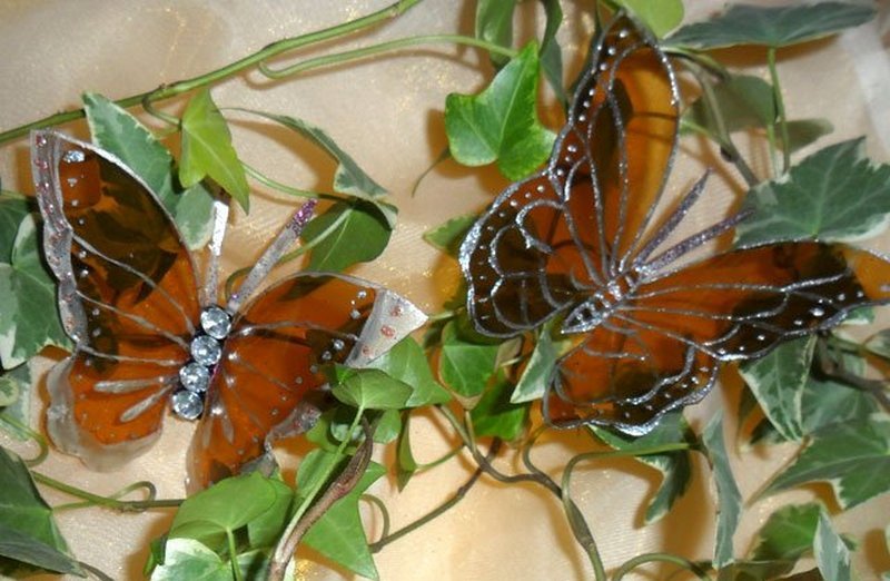 La falta de colores brillantes en el interior se puede restaurar con éxito con la ayuda de la costura decorativa. Un material adecuado y asequible para actividades creativas es una botella de plástico. Las elegantes mariposas hechas a mano con plástico complementarán cualquier composición de la calle.