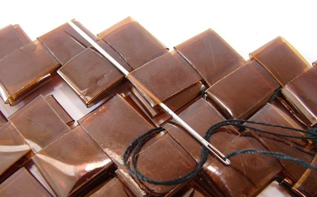 Estera de las sábanas. Necesitaremos pegamento de silicona, una base de goma, agentes desengrasantes, cubiertas multicolores. El proceso llevará un poco de tiempo. Es necesario desengrasar la base y las cubiertas, extender la base con pegamento. Pegue las portadas, puede colocarlas al azar o crear un adorno, dibujando.
