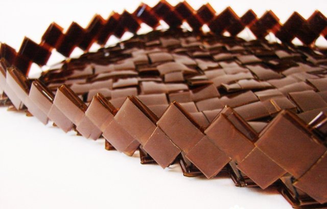 El segundo método es el tejido de ajedrez. A menudo requiere una forma adicional, por ejemplo, una caja de cartón. En este caso, las tiras se cortan de manera diferente, solo se obtiene una cinta larga de la botella. Luego giran la base de la caja de cartón hacia arriba y tejen el fondo de la canasta, luego de lo cual proceden a sus caras laterales.