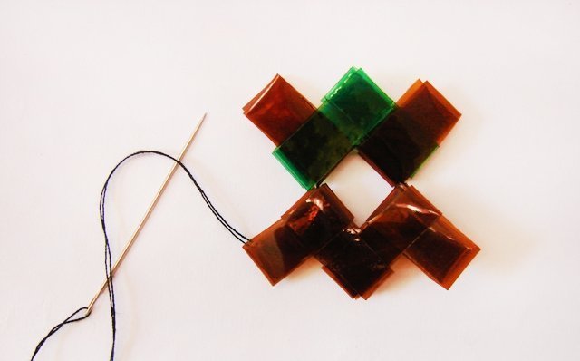 Conectamos los elementos obtenidos con los mismos hilos en un solo plano, después de lo cual le adjuntamos los mangos con clips de papel especiales;