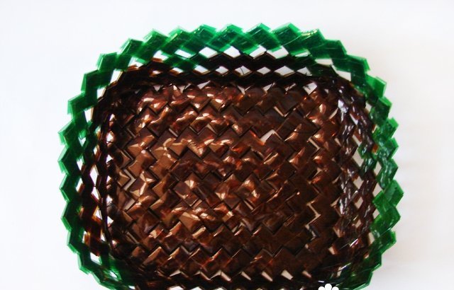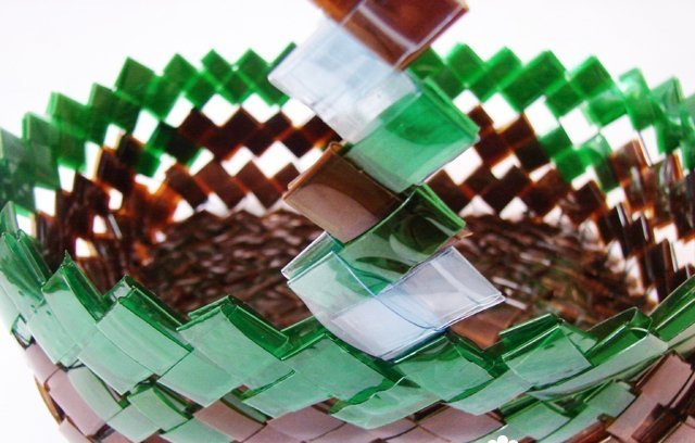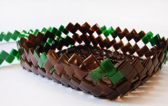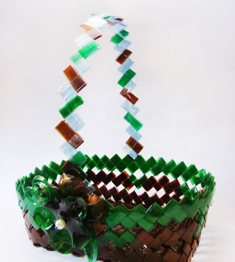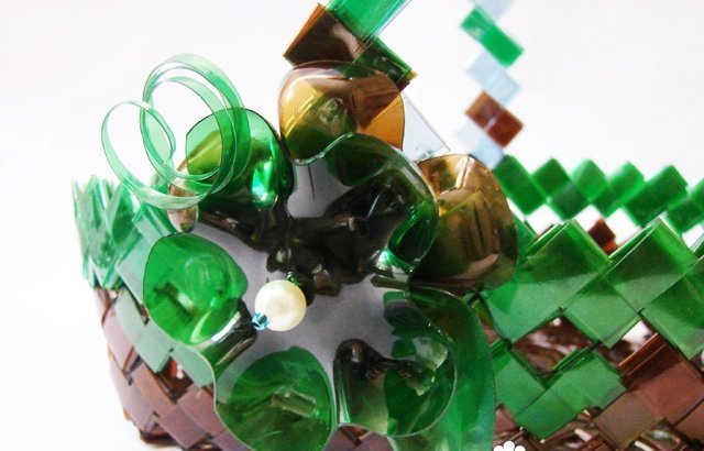 Hay varias formas en que se crean cestas. Lo más simple es tejer con esquinas. Para hacer esto, las botellas se cortan por dos lados y se marcan en ellas. Según el marcado, se cortan tiras de la pieza de trabajo obtenida, que se tejen juntas. Si es necesario, haga la parte inferior de la canasta, coloque la manija.
