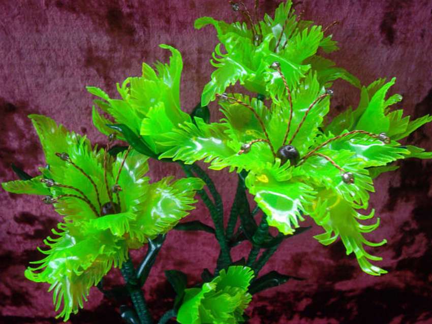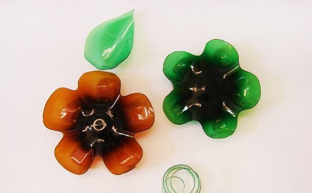 Para crear una decoración de este tipo, necesita dos fondos de botellas del mismo color y dos anillos de plástico: 5 cm y 1 cm de ancho. De los recipientes verdes, corte los folletos y rasque las venas con un punzón. Con un punzón calentado perforamos uno de los fondos, insertamos una tira estrecha y una parte con hojas. Arreglamos el tallo artificial con pegamento. Luego conectamos las dos mitades y lo fijamos con cinta adhesiva en ambos lados. Pegamos los bordes de la caja decorativa con una cinta de raso. Para que las partes no se pierdan, puede arreglarlas con un cordón o hilo.