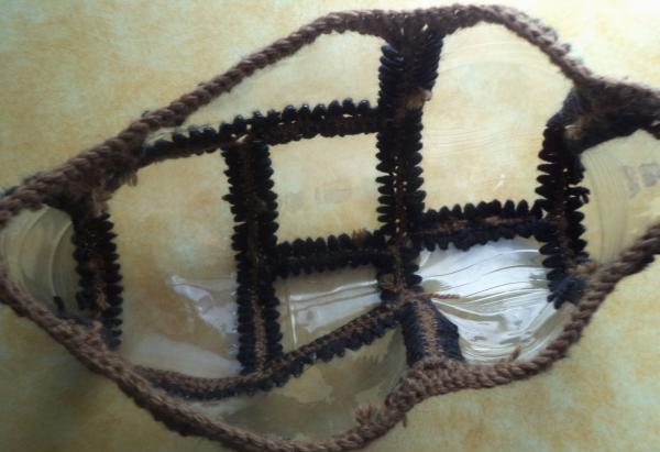 En el fondo del recipiente de agua, hacemos rayas verticales con un grosor de no más de 2 centímetros. Omita el hilo preparado de polietileno entre las tiras de la botella en un patrón de tablero de ajedrez. Si durante el trabajo aparecen irregularidades materiales inusuales, se pueden eliminar fundiendo con un encendedor. Se puede dejar una maceta interesante en el alféizar de la ventana o colgarla en la pared, pasando la cinta entre el tejido.