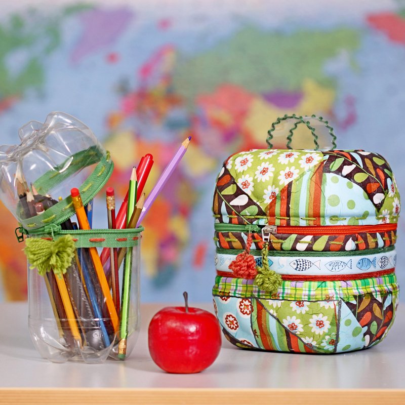 Puede crear pedidos en su escritorio con la ayuda de un organizador amplio y conveniente de varias celdas. Lo hacemos con seis botellas de plástico grandes debajo de cualquier líquido no tóxico. Mejor si el plástico está apretado. Comenzamos dividiendo todas las botellas en dos partes. Ponemos las mitades superiores con la tapa a un lado, no las necesitaremos. Colocamos recipientes cilíndricos en dos filas y envolvemos el perímetro con cualquier pieza de tela hermosa. La parte inferior del organizador puede cerrarse con un segmento rectangular o dejarse como está. Para la decoración del borde superior, puede usar encaje, hermosos cordones, cintas de raso.