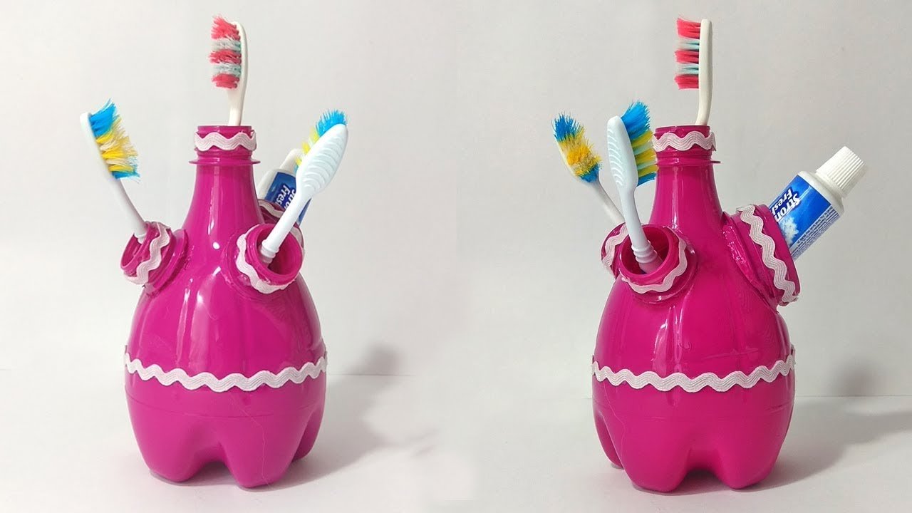 Un stand interesante para cepillos de dientes y pastas. Para hacer esto, corte la botella por ambos lados, pegue las partes superior e inferior. Corte un cuello ancho y un par de cuellos estrechos de otro recipiente de plástico. Luego pegarlos al producto, pintarlo. Ponga la pasta en la boca ancha y cepillos en el cuello estrecho.