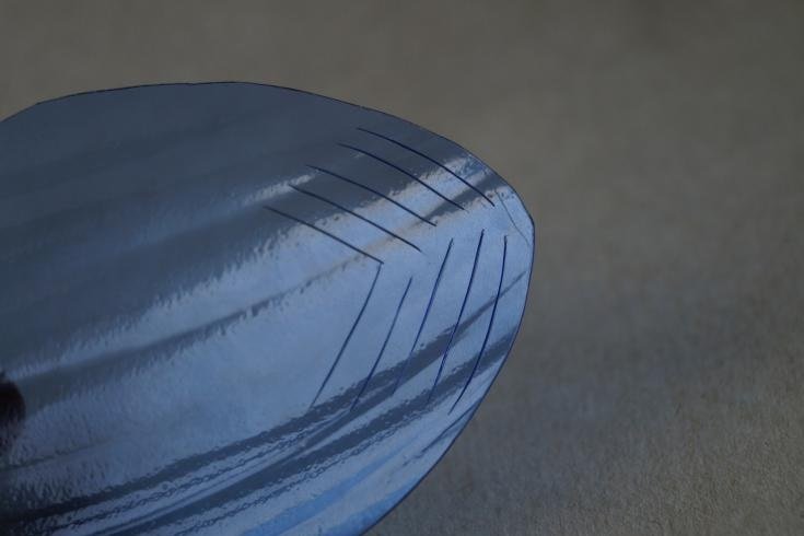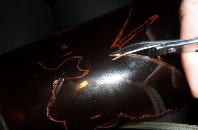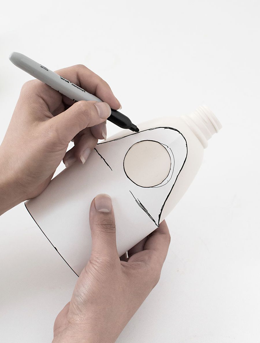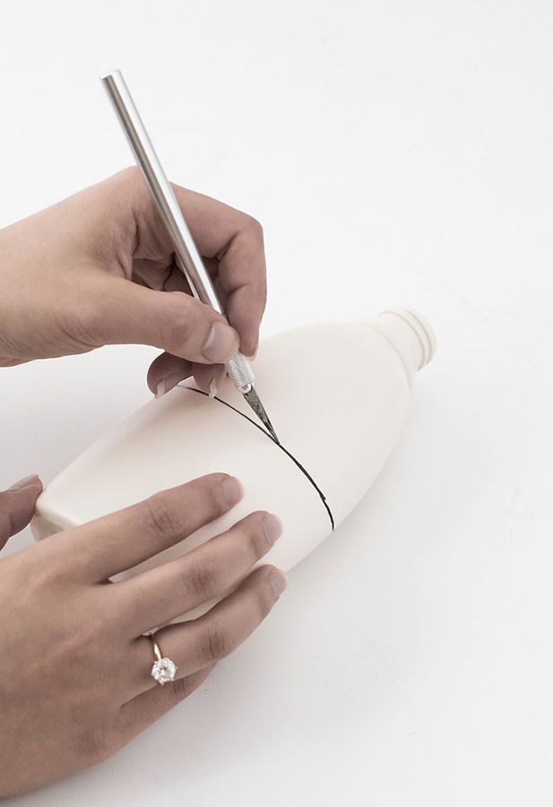 Marcador de marcador de la siguiente manera: - en uno de los planos grandes en el área, dibuje una línea recta paralela a la base, que se extiende antes del comienzo de la curva de la botella hasta el cuello; - a lo largo de los bordes del acoplamiento con otros planos, en ambos lados dibujamos líneas hacia abajo, sin llevar diez centímetros a la base inferior;