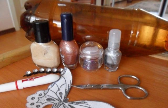 Topetón Usaremos una botella de cerveza marrón. Corte flores de diferentes tamaños y ensarte en un hilo de pescar. Si lo desea, los bordes pueden quemarse con un encendedor;