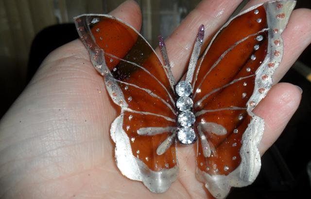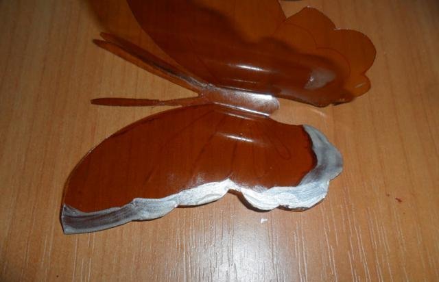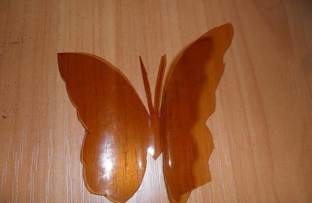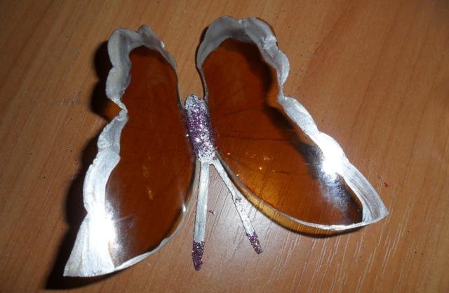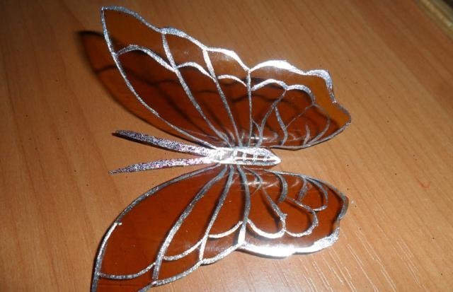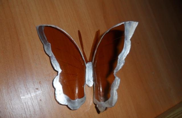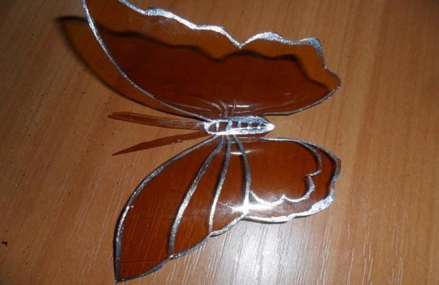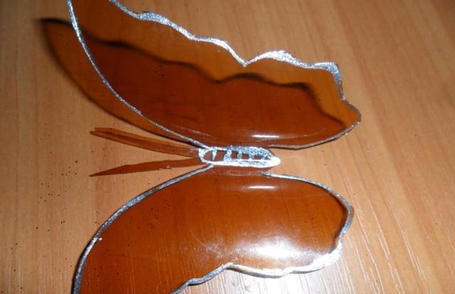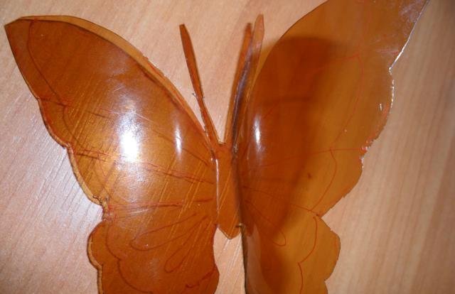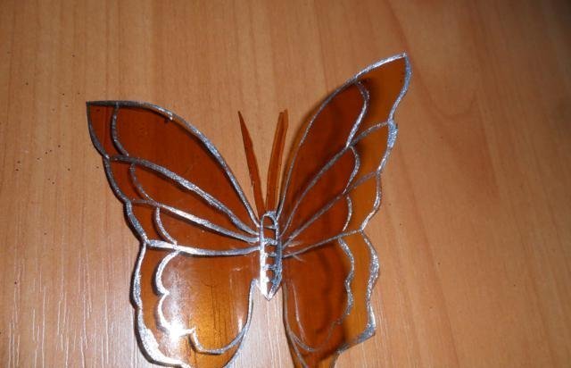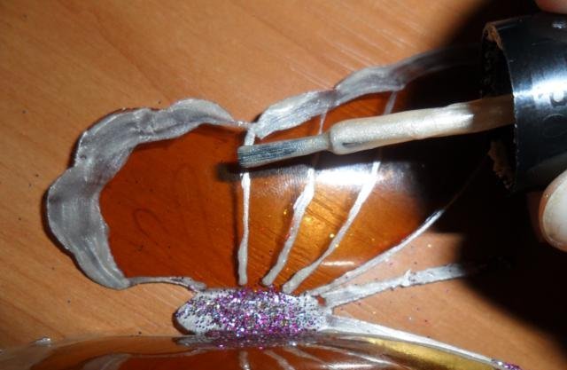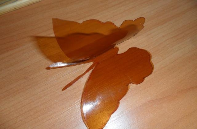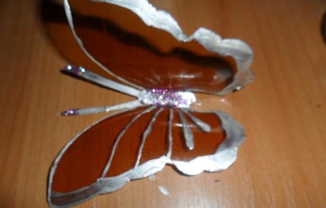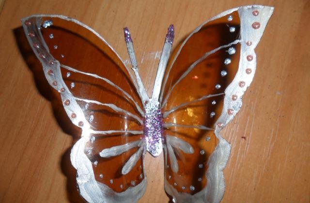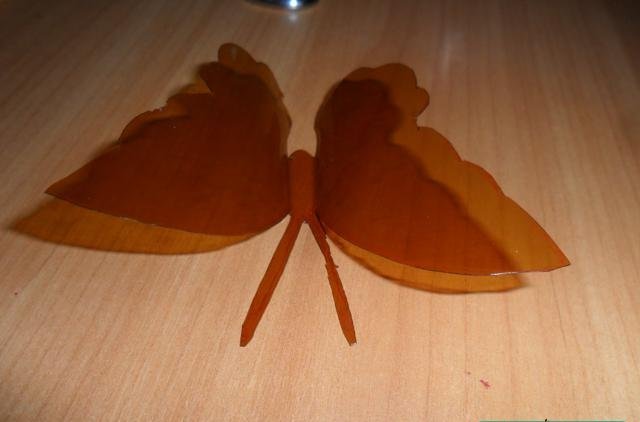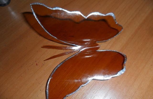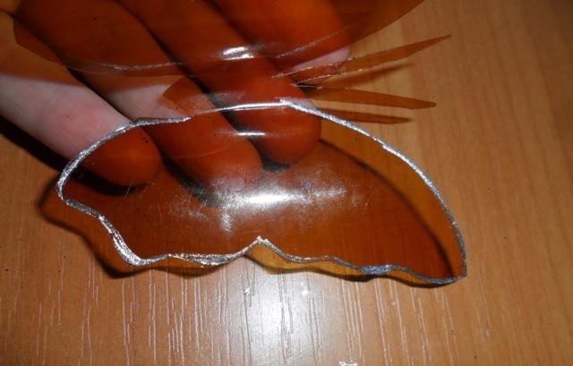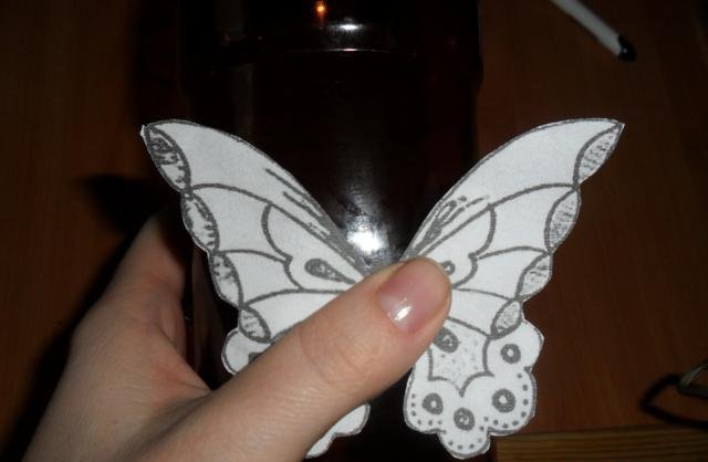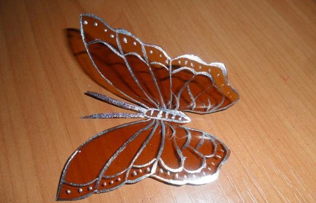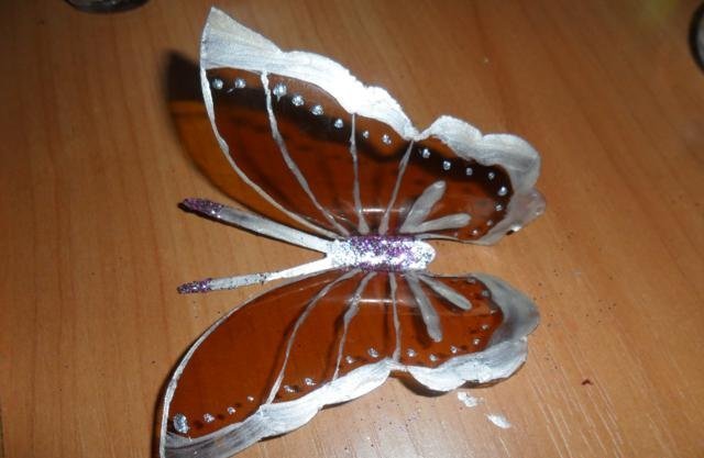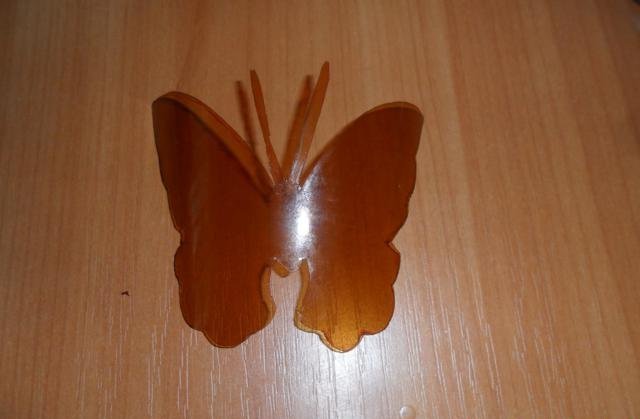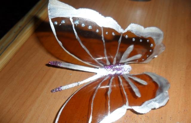En primer lugar, debe deshacerse de la parte superior e inferior de la botella. Trabajaremos solo con el cilindro. Enderezamos el plástico con una plancha a través de papel y recortamos la mariposa de acuerdo con una plantilla marcada previamente. El blanco está listo para pintar. Marcamos con marcadores y pintamos sobre vidrio con pintura. Con la ayuda de alambre y cuentas, puede hacer patas y antenas.