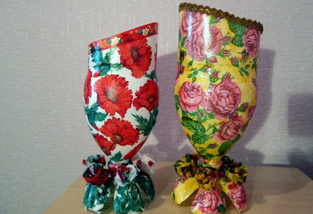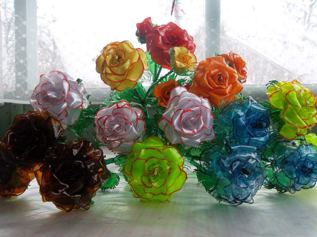 Puede crear arreglos florales y ramos de flores desde cualquier recipiente de plástico.Son adecuados frascos de actimel, huevos de sorpresas más amables, envases para mascotas con jugos y botellas comunes de bebidas.