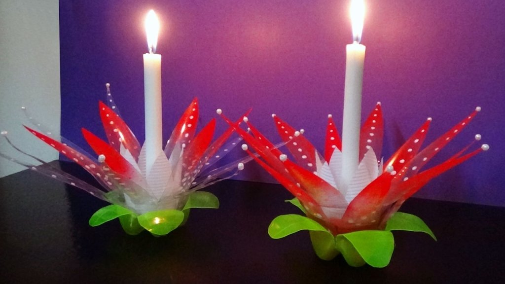 Los candelabros decorativos se pueden hacer tanto de recipientes de vidrio como de plástico. La segunda opción es igualmente funcional y segura. Puede crear una hermosa decoración para mayor comodidad desde la parte inferior o superior de la botella. Cortamos la parte con el cuello, la instalamos en el soporte, decoramos con materiales no combustibles. Pueden ser piedras naturales, cuentas, alambre. Una vela alargada ordinaria es adecuada para este producto.