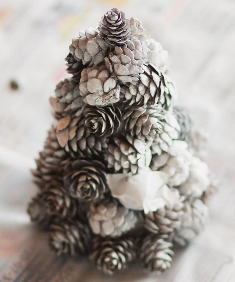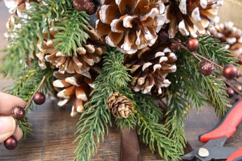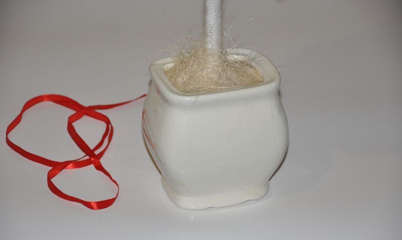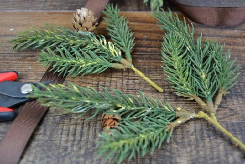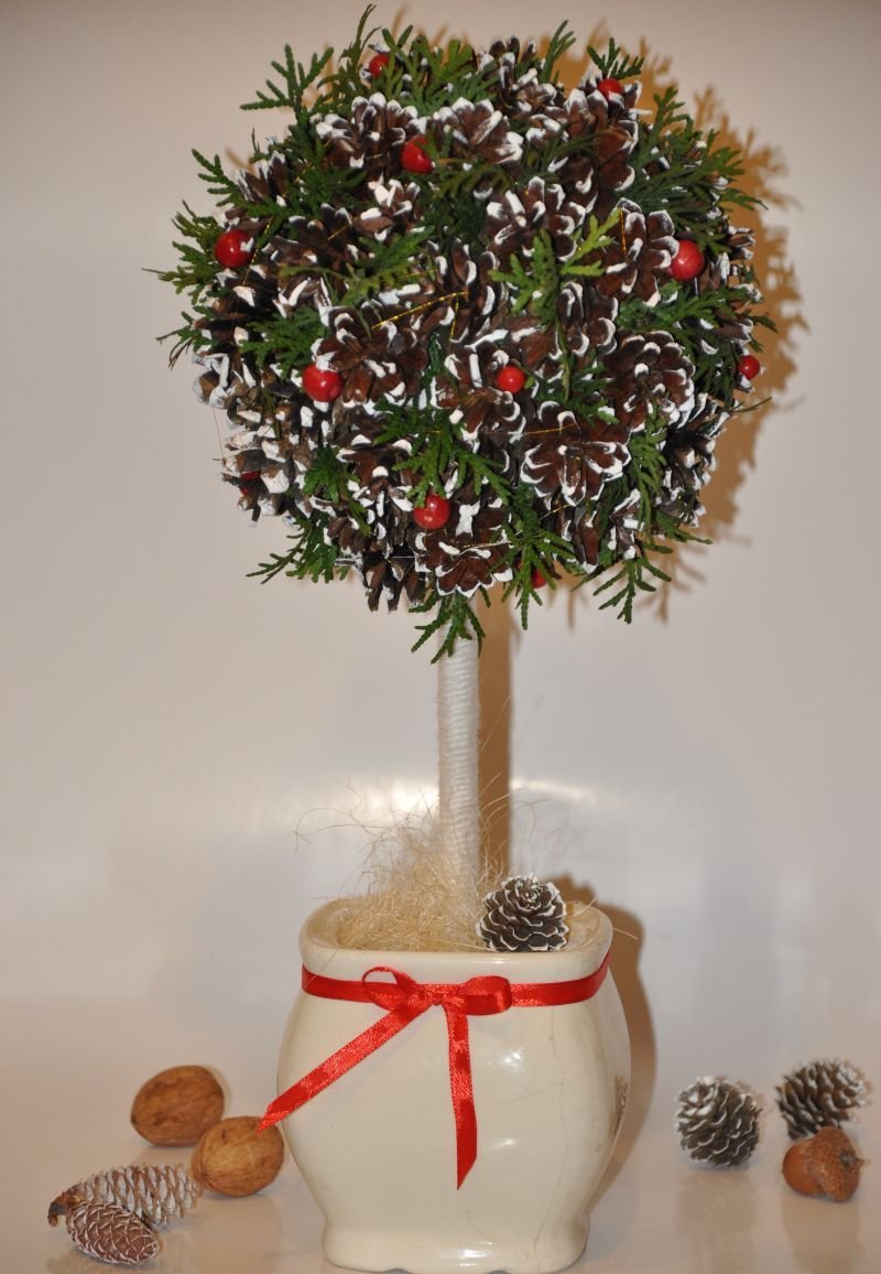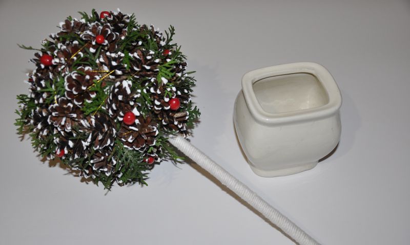 Además de los brotes, se usan ramitas (por ejemplo, arborvitae) para crear un árbol artificial y cuentas o cintas para la decoración. Preferiblemente, los conos son de pino en lugar de abeto, ya que son más redondeados. Necesitará una bola de espuma o espuma de poliuretano, pegamento, alfileres florales, espuma, un palo de madera y una olla. Un recipiente vacío está lleno de espuma floral. Luego se coloca un palo en el centro de la maceta (un poco más de medio metro de longitud). Se fija una pelota sobre ella. Los postes se pegan a los conos, después de lo cual se unirán a la pelota. La espuma floral está cubierta con pegamento caliente y espolvoreada con musgo. En el tronco, debajo de la pelota, puedes hacer un arco con una cinta decorativa de color.Hay una opción interesante sobre cómo puedes hacer una maceta tú mismo o prepararla: las ramas pequeñas se unen y se unen. Resulta la forma cilíndrica perfecta.