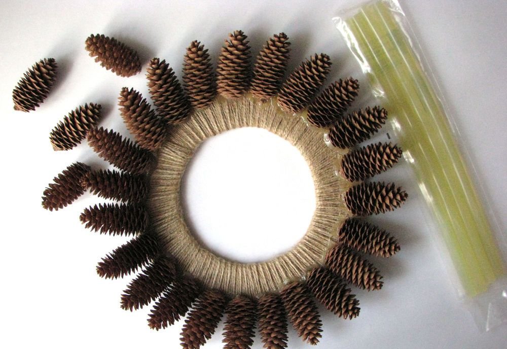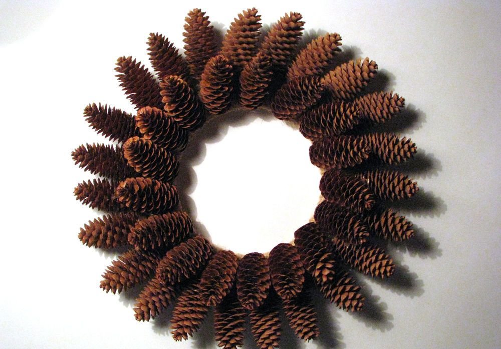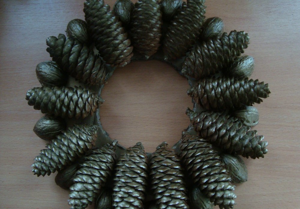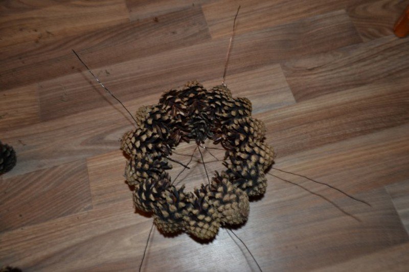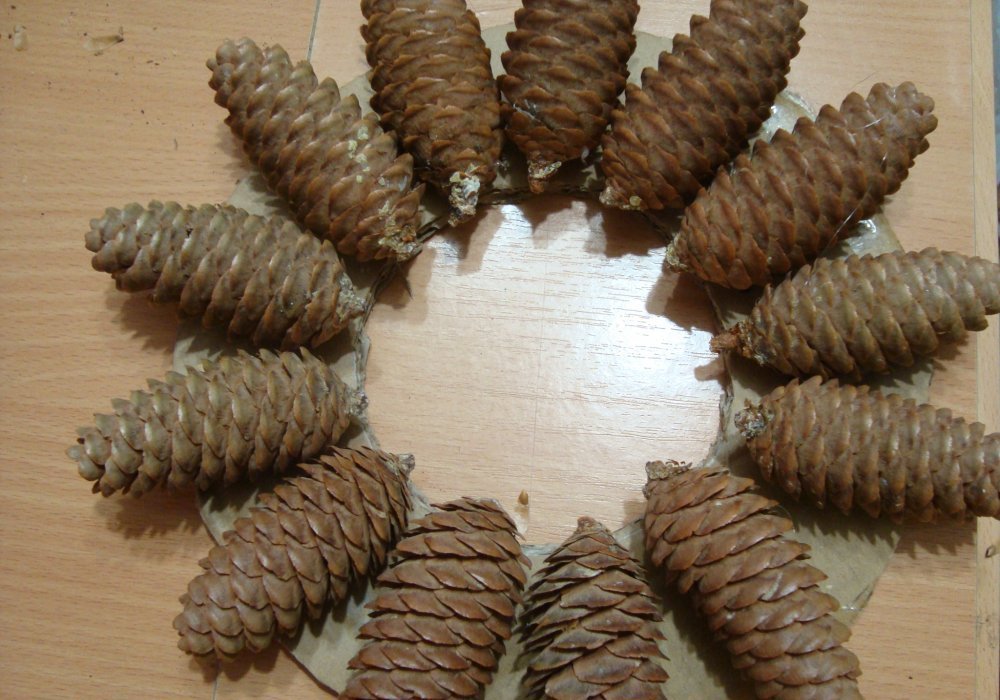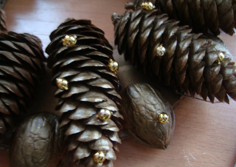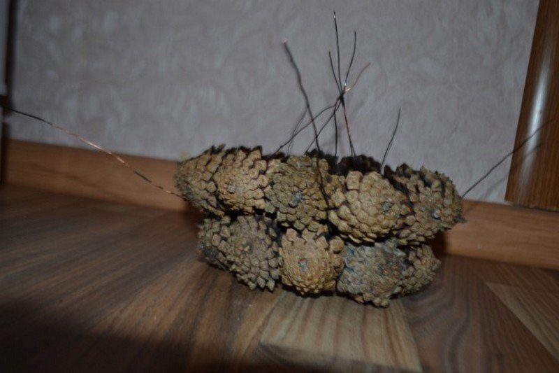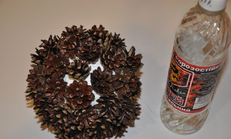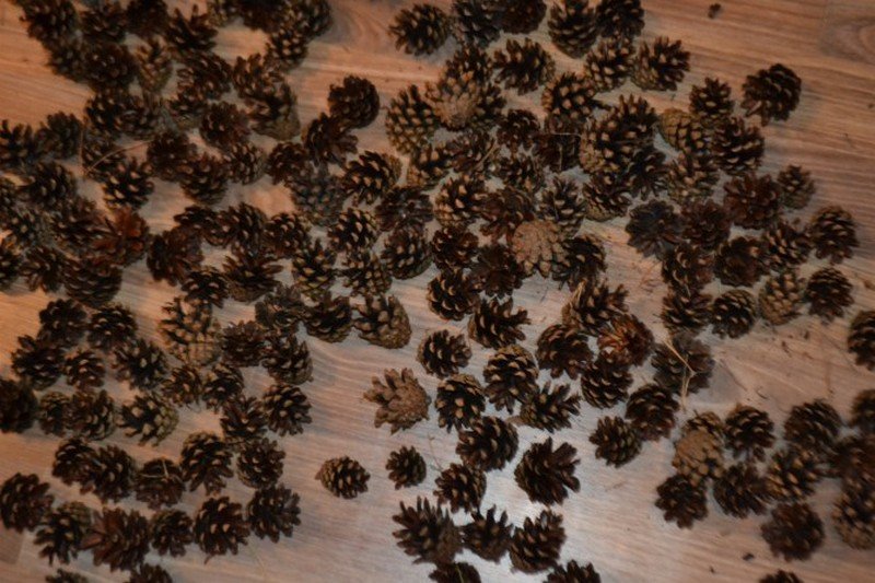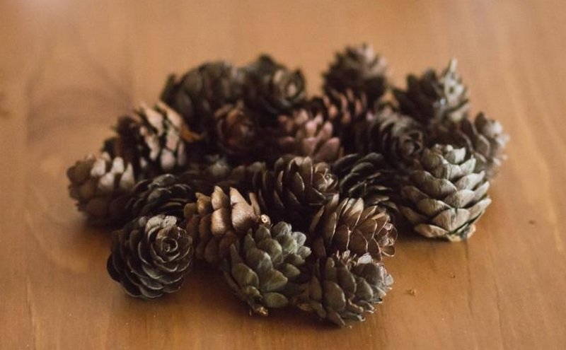 Inicialmente determinado con tamaño y forma. Si necesita el más redondeado, se requerirán conos de pino. Abeto más alargado, a veces es mejor tomarlos. Solo se seleccionan riñones simétricos, teniendo en cuenta qué producto o pieza se debe fabricar. No trate inmediatamente los conos con un aerosol, es mejor cerrarlos en una bolsa hermética y dejarlos durante varios días. Después de esto, se lavan los riñones. Se colocan en un recipiente con agua tibia, se agrega detergente allí y se mantiene durante media hora. Luego, los conos se lavan y se colocan sobre papel. Los residuos se eliminan con hisopos de algodón sumergidos en alcohol. Los pequeños animales que viven en huecos se eliminan con la ayuda de vinagre. El agua se mezcla con una solución de vinagre al 6% en la misma proporción, coloca los conos allí y espera unos 30 minutos. Luego se secan nuevamente. Después de un tiempo, los riñones secos se cubren con barniz en aerosol.