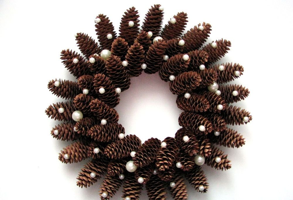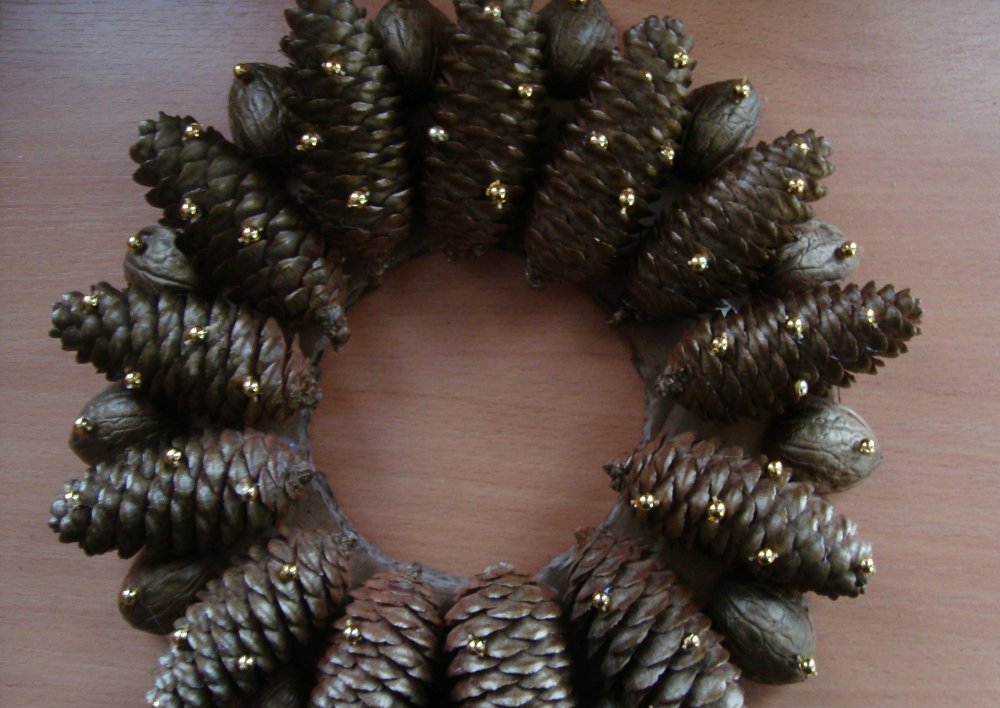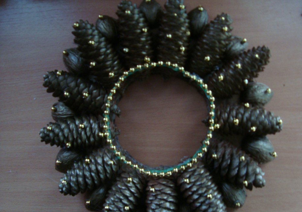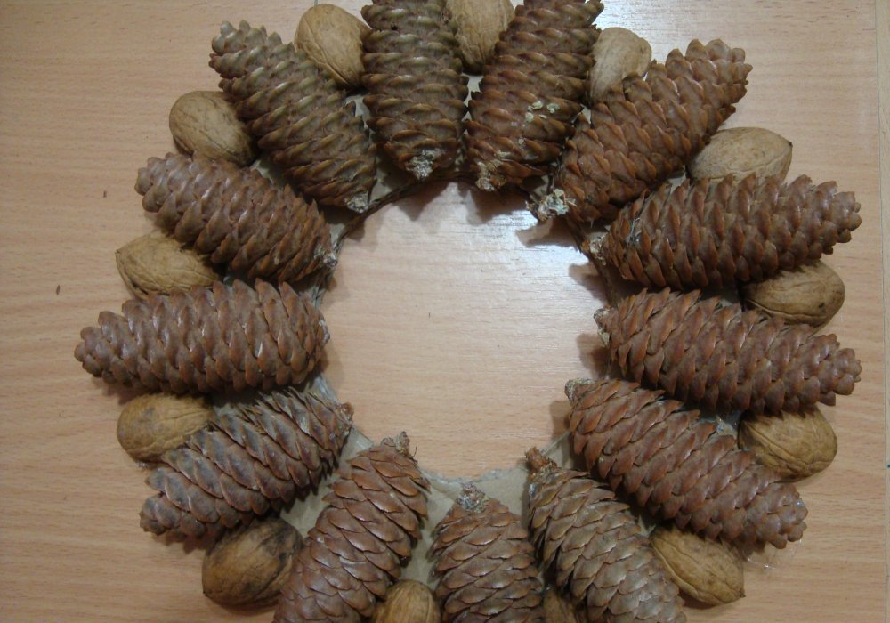 Antes de hacerlo, debes obtener una pistola de pegamento caliente. Como base, es útil una corona retorcida de ramas de sauce. Las ramitas de sauce pueden reemplazar el cartón corrugado. La forma redonda está formada por conos alrededor de todo el perímetro. Es necesario alternar los riñones de diferentes formas y tamaños. Ellos, como la propia corona, se pueden pintar con pintura en aerosol o dejar en color natural. Otros elementos también se utilizan en la composición: castañas, vainas, bellotas, hojas caídas, ramitas pequeñas. En la parte superior de la estructura, vale la pena arreglar algún tipo de figura. Figuritas adecuadas en forma de ángeles. Las campanas están colgadas debajo. La bisutería puede actuar como elementos decorativos adicionales: un cordón de cuentas, un collar roto y cuentas con perlas. Para estos fines, también se utilizan estrellas de plástico multicolores.