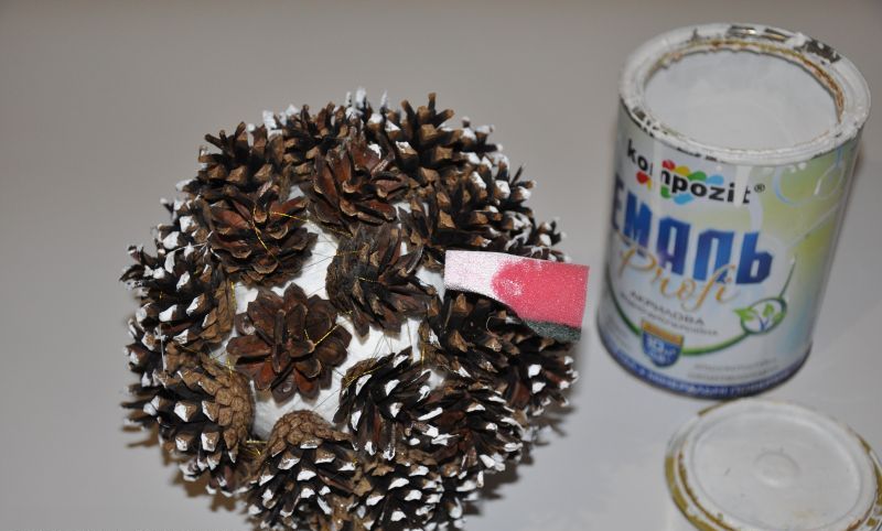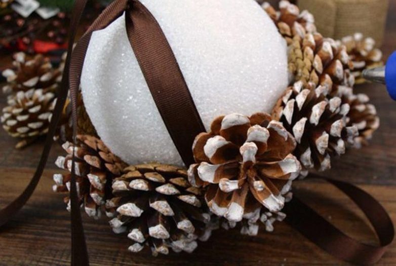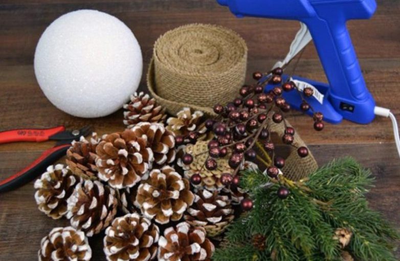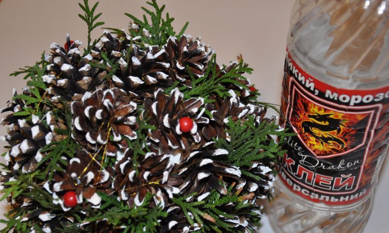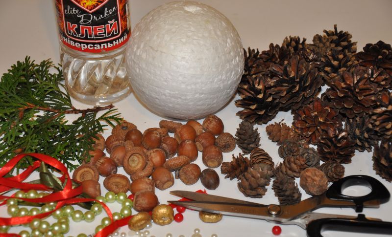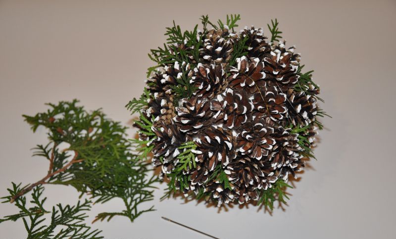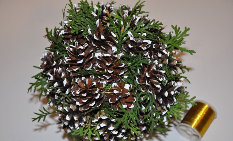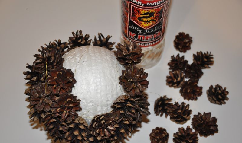 Necesitará: conos, lacas para el cabello, cinta adhesiva, alambre, una bola de espuma; algunos también usan destellos. La base: se puede hacer una bola de espuma con sus propias manos. Primero, se aplica barniz a los conos, espolvoreado con elementos brillantes. Luego se toman por separado y se une un trozo de alambre cortado a la parte inferior de cada riñón. Para hacer esto, debe hacer un bucle y atar los copos inferiores con él. Una forma menos confiable es enrollar parte del cable en una espiral y pegarlo en la parte inferior del cono. Todos los riñones a su vez se unen a la pelota con el extremo libre del cable. Para colgar toda la estructura con cinta adhesiva. La base generalmente está hecha de espuma de poliestireno. La pelota confeccionada se puede comprar en tiendas especializadas.Para hacerlo usted mismo, debe moler la pieza de trabajo en pequeños fragmentos y pegarlos. Para dar una forma redondeada, la pelota se procesa con palmas o un cuchillo de oficina.