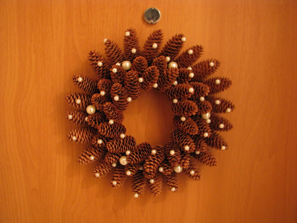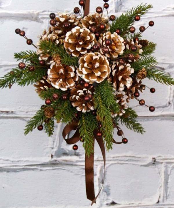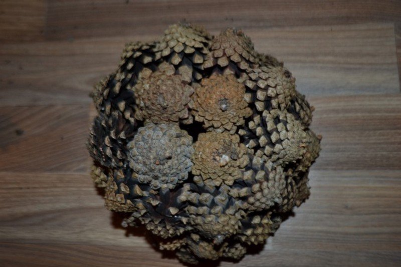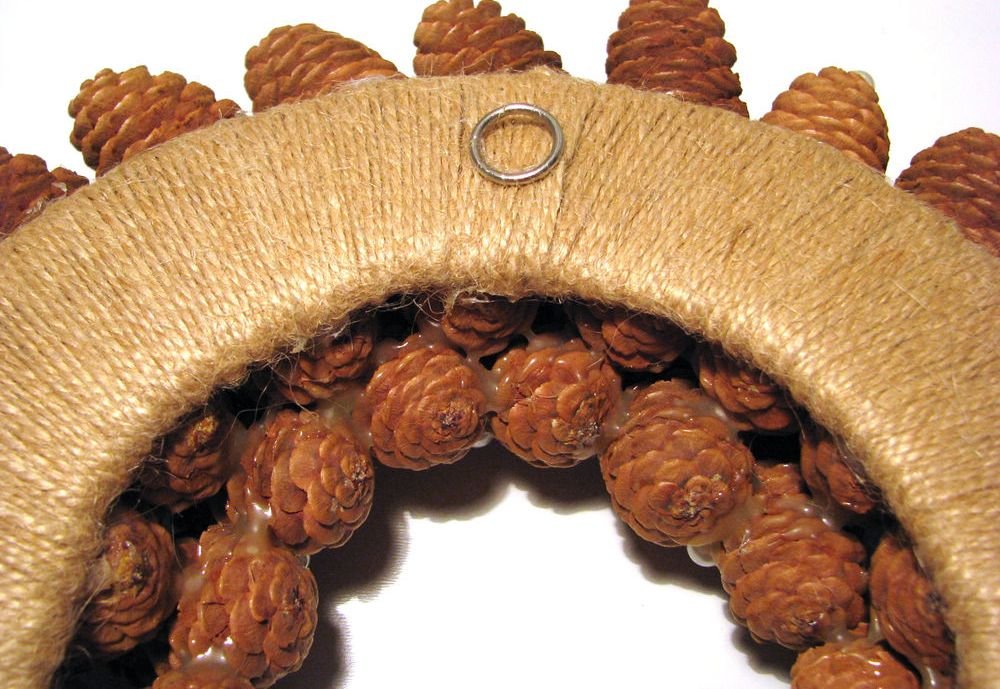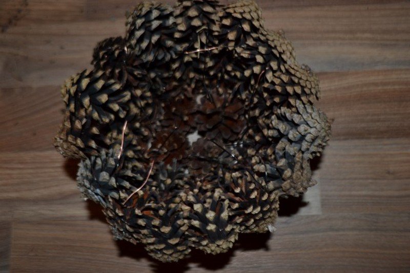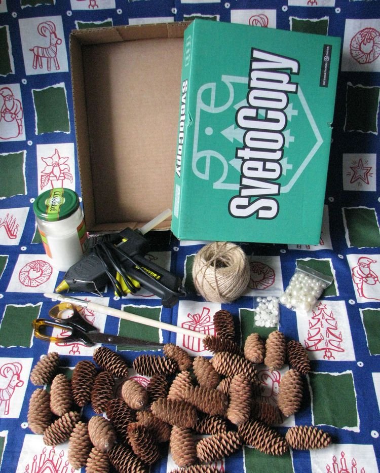 Necesitará: conos, lacas para el cabello, cinta adhesiva, alambre, una bola de espuma; algunos también usan destellos. La base: se puede hacer una bola de espuma con sus propias manos. Primero, se aplica barniz a los conos, espolvoreado con elementos brillantes. Luego se toman por separado y se une un trozo de alambre cortado a la parte inferior de cada riñón. Para hacer esto, debe hacer un bucle y atar los copos inferiores con él. Una forma menos confiable es enrollar parte del cable en una espiral y pegarlo en la parte inferior del cono. Todos los riñones a su vez se unen a la pelota con el extremo libre del cable. Para colgar toda la estructura con cinta adhesiva. La base generalmente está hecha de espuma de poliestireno. La pelota confeccionada se puede comprar en tiendas especializadas.Para hacerlo usted mismo, debe moler la pieza de trabajo en pequeños fragmentos y pegarlos. Para dar una forma redondeada, la pelota se procesa con palmas o un cuchillo de oficina.