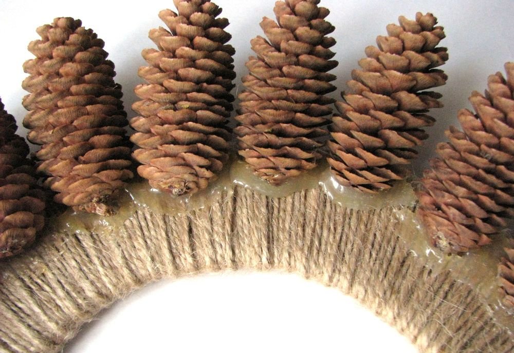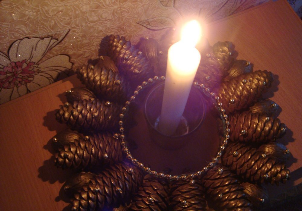 El soporte está hecho de uno o más conos. Se puede unir una vela oblonga o de té al producto. Además, use platos y recipientes planos. Un frasco decorado con un lazo se ve hermoso con una pequeña vela en un cono de pino. Esta es una breve lista de ideas para construir una vela. Aguja que necesita alicates de punta fina. Con su ayuda, las escalas están alineadas. La parte inferior del riñón debe estar paralela a la superficie. Esto también se aplica a la parte superior: se nivela, después de lo cual se aplica pegamento caliente para fijar la vela. Se proporciona una fijación confiable gracias a un pasador de metal: se monta una vela en la punta. En este caso, no se necesita pegamento. En lugar de un alfiler, también se usan agujas de coser. Por razones de seguridad, se hace una junta (generalmente hecha de papel de aluminio) para que la cera caliente no penetre en el producto.