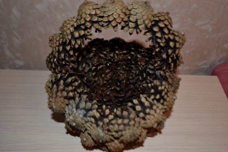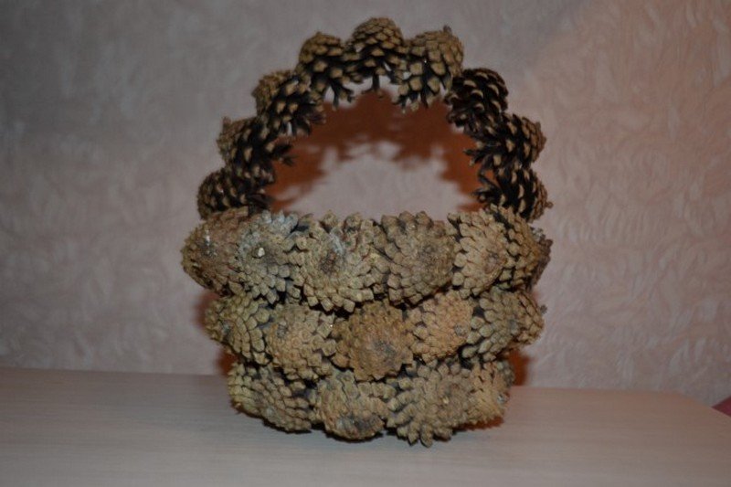 La base para crear tal oficio es el alambre y los conos mismos. Primero, los riñones se clasifican (dependiendo de la parte de la canasta para la que son). La base se hace por separado del mango, después de lo cual están conectados. En su calidad, se utilizan los riñones o cartón, unidos con pegamento caliente. Tomará varias horas para trabajar. Los conos se pueden girar tanto hacia afuera como hacia adentro. La canasta está decorada con plantas verdes, flores, frutas y verduras frescas o artificiales, se colocan follaje amarillento en el interior. Se tratan con spray de barniz. Si fija el mango de forma segura, la embarcación se ajustará para un uso práctico como canasta. Para mantener la forma durante mucho tiempo, se seleccionan conos anchos, abiertos al máximo. El producto complementará el ambiente festivo: Año Nuevo o Pascua.