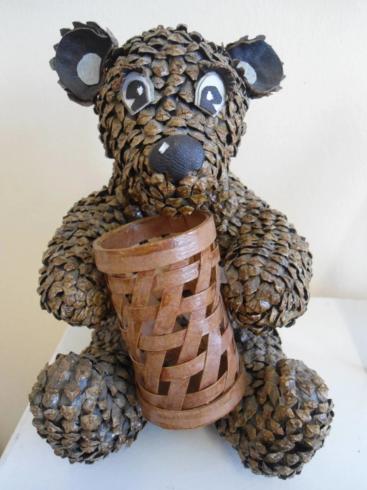 Para crear una decoración en forma de erizo, necesitarás una botella de plástico. Apto uno y medio o dos litros. Se corta por la mitad, la parte inferior se empuja hacia la superior, de modo que la forma y el tamaño sean realistas. Es posible que deba cortar el centro de la botella, de unos centímetros de largo. Después de eso, en el lado donde se encuentra la tapa, se dibuja la "cara" del erizo. Los conos se pegan. Se aplica pegamento a la parte superior de la estructura, y luego se pegan a la botella. Varios pedazos de alambre se fijan debajo de la cubierta. Se verán como un bigote. La artesanía se fija con barniz. Hay varias formas de hacer un oso. La primera es una pequeña figura hecha de una bola de hilo y pequeños conos en forma de extremidades. Un oso de tamaño mediano está hecho de una docena de conos, conectados individualmente en el tronco, la cabeza, los brazos y las piernas. Si desea diseñar un oso grande, necesitará dos bases de poliestireno. Las extremidades se crean a partir de varios conos colgados de un cable.