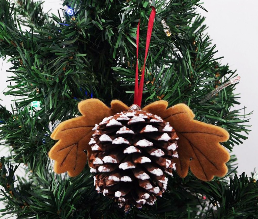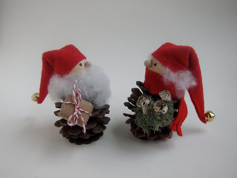 Como juguetes navideños, se pueden usar bolas de espuma decoradas con pequeños conos. Hay muchas otras opciones interesantes. Los conos, plastilina, bolas de madera y fieltro son útiles para crear figuras de elfos. Además, los animales están hechos de estos materiales: rebozuelos, ratones, ardillas, erizos. Para crear una guirnalda festiva, necesitará un cepillo, pinzas, alicates, hilo, sellador en aerosol, tornillos con ganchos en forma de O y papel de aluminio para la decoración. Los riñones se limpian de suciedad y polvo, se les aplica pegamento. Luego se decoran con papel de aluminio (dorado o plateado). Se puede reemplazar con destellos o pintura en aerosol. Los tornillos de gancho se atornillan en el medio de la base de los riñones. Después de eso, las protuberancias se tiran sobre un hilo grueso. Es necesario calcular la longitud ideal, porque los riñones deben repararse de inmediato.