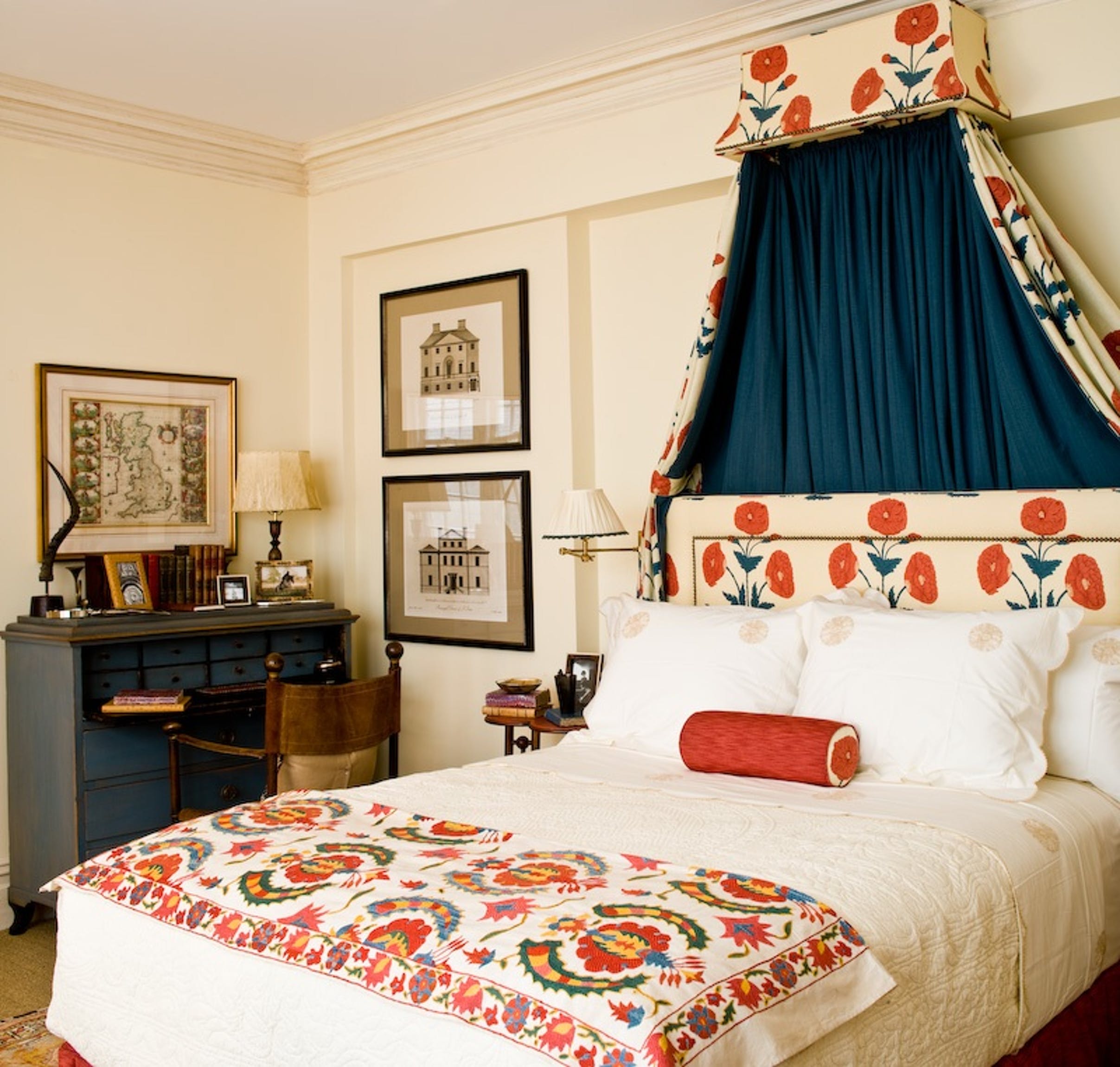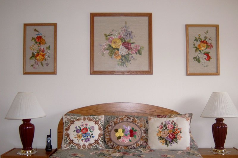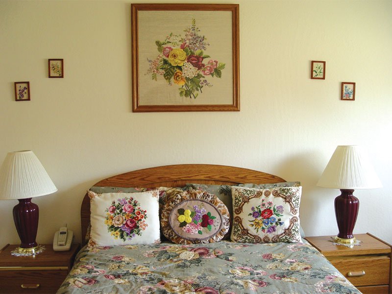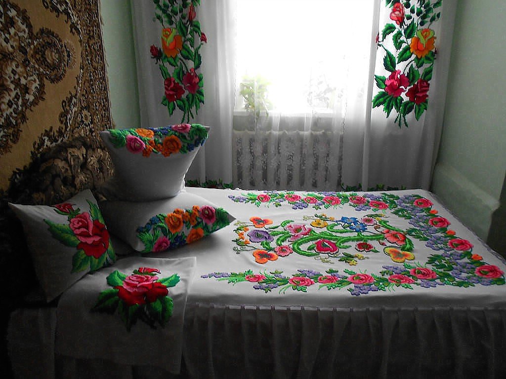 En el dormitorio, el bordado se encuentra en cuadros, ropa de cama, cortinas, almohadas. Lo principal es que debe encajar armoniosamente en el interior. Las mantas bordadas brindarán comodidad y calor en las largas noches de invierno. Los patrones en las cortinas deben coincidir con el tono de los muebles, colchas, sin romper el estilo general. La ropa de cama se hace en tonos tranquilos, lo que contribuye a conciliar el sueño lo más posible: rosa, verde claro, violeta. El diseño general es monocromo recomendado, por ejemplo, bordado calado en blanco sobre blanco.