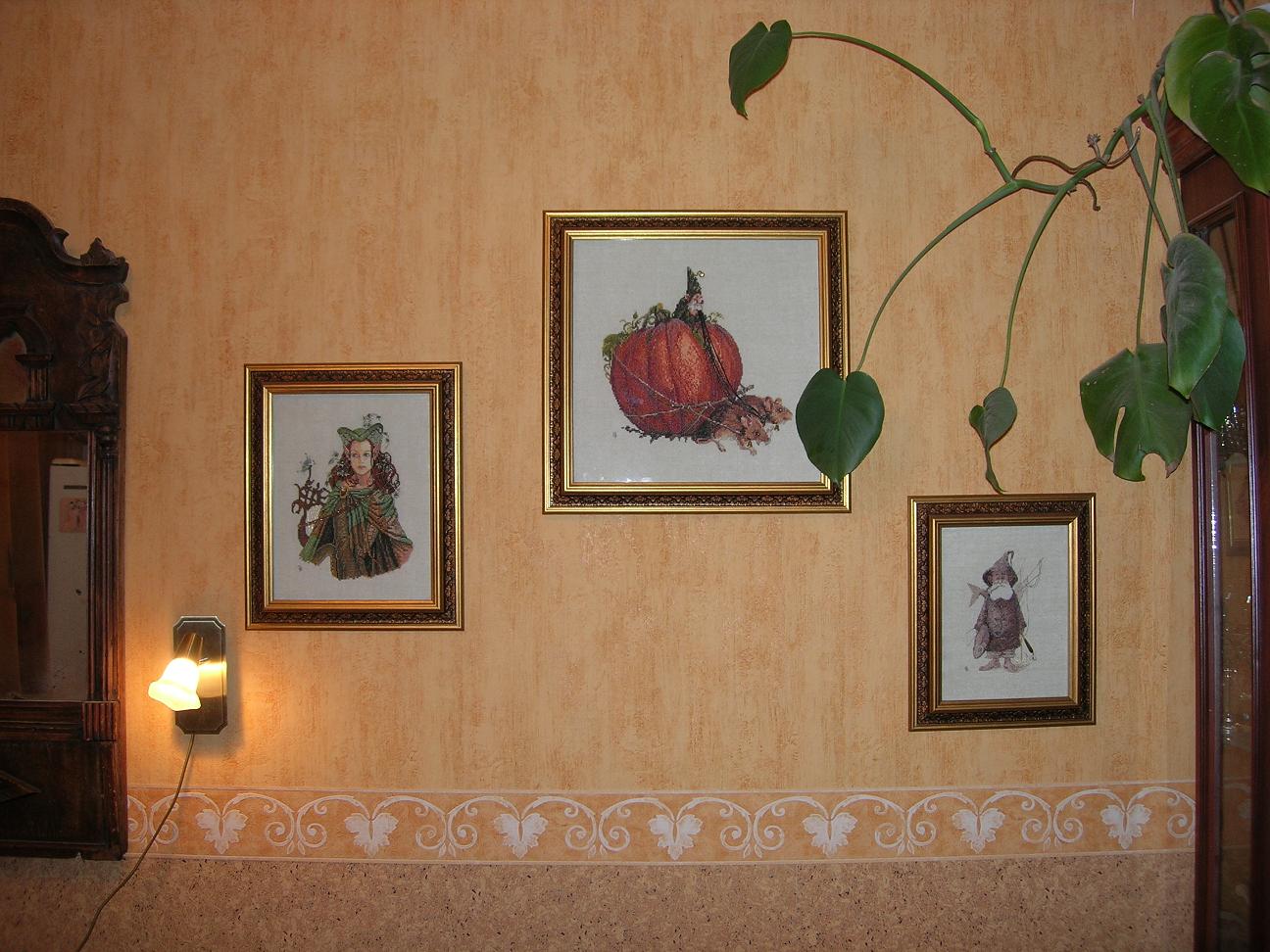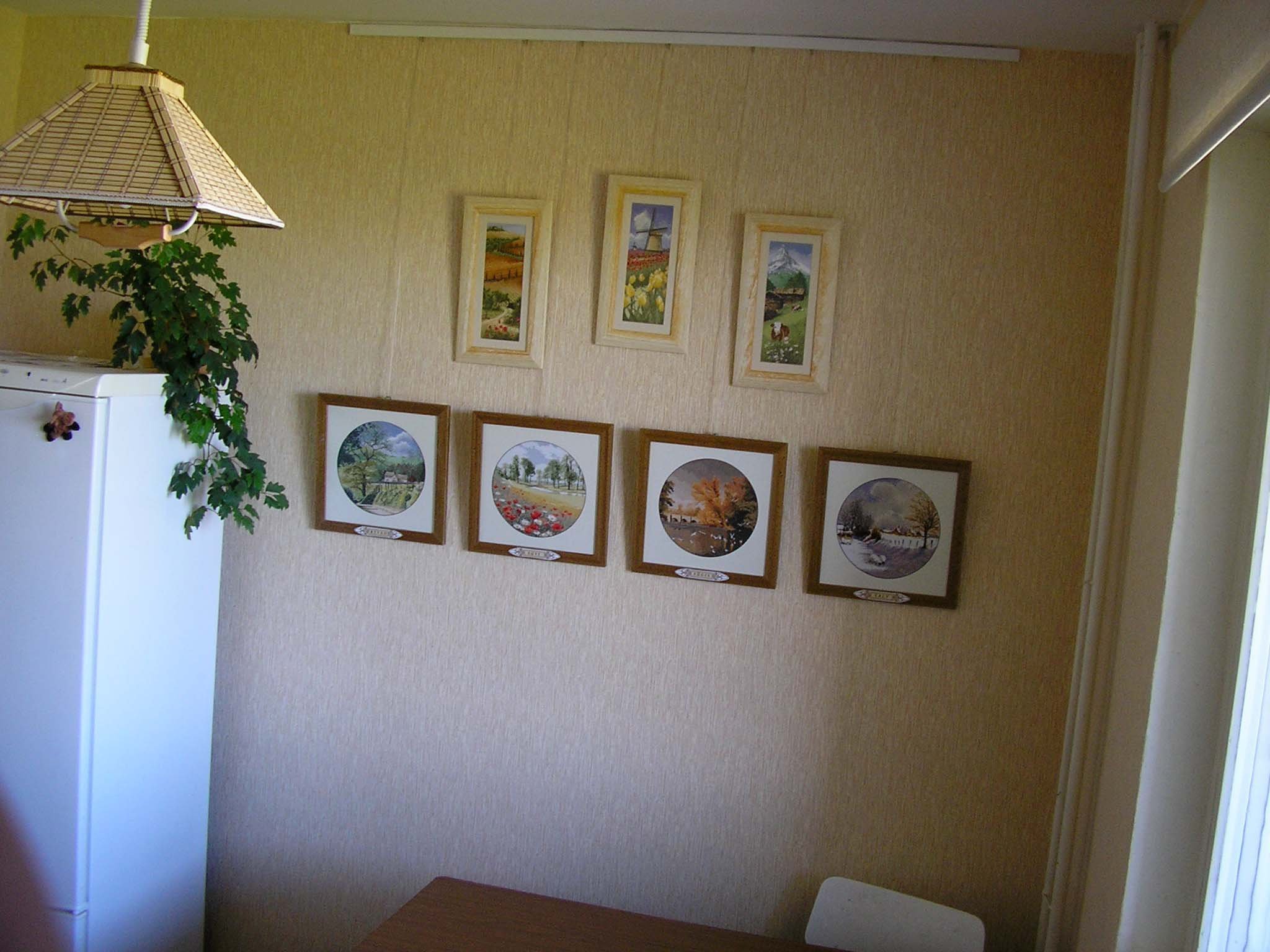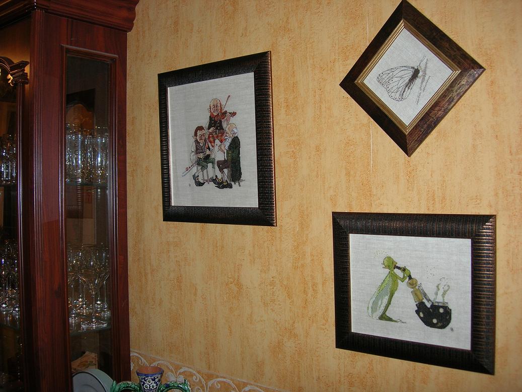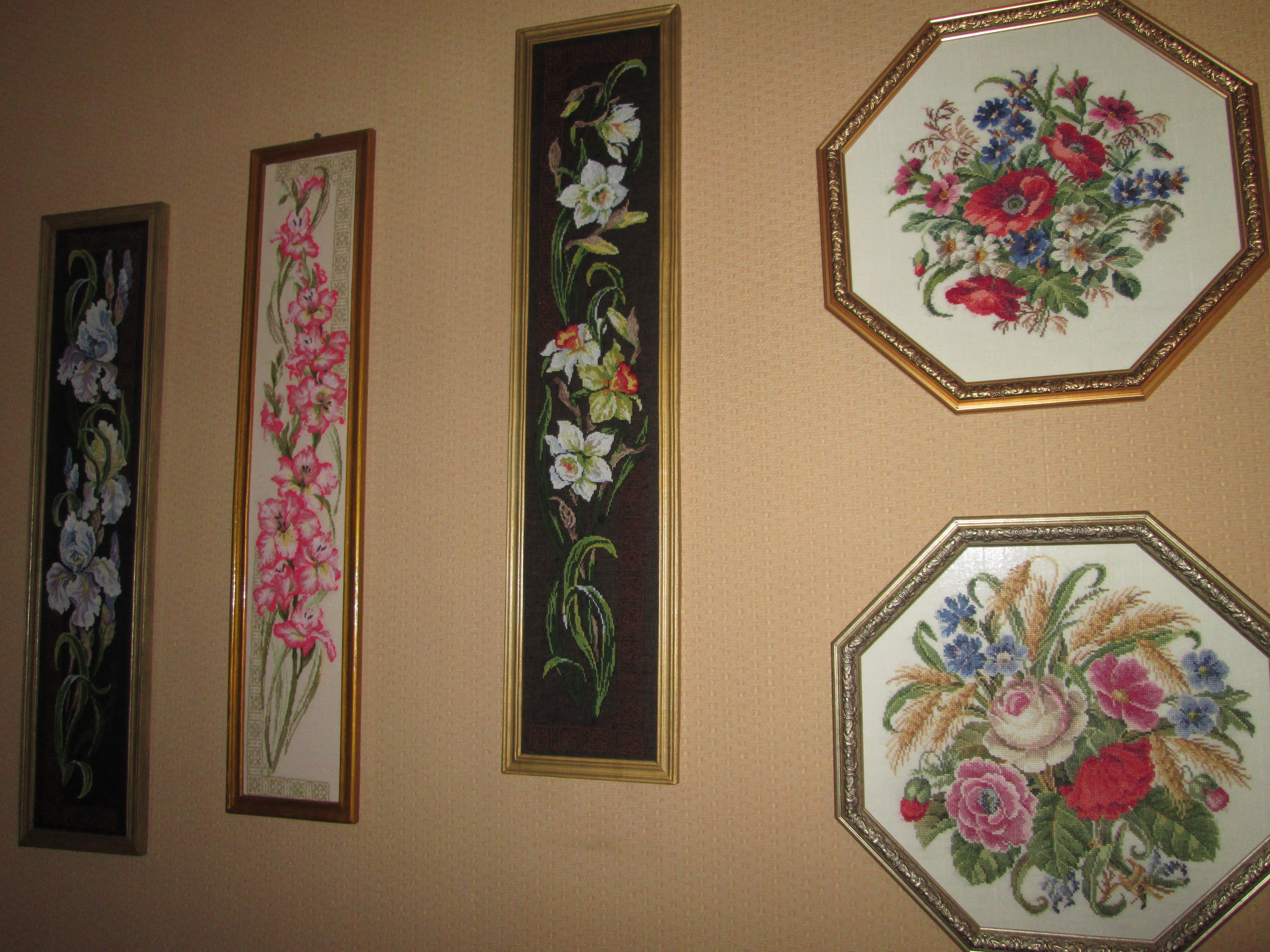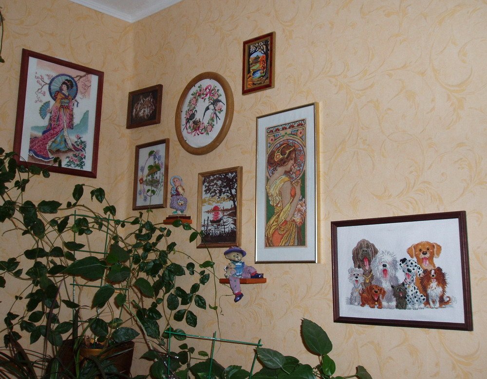 Si hay muchas pinturas bordadas en la habitación, son del mismo tamaño, entonces deben colgarse al mismo nivel. Las imágenes de diferentes tamaños y formas se organizan en grupos, las más grandes en el centro.