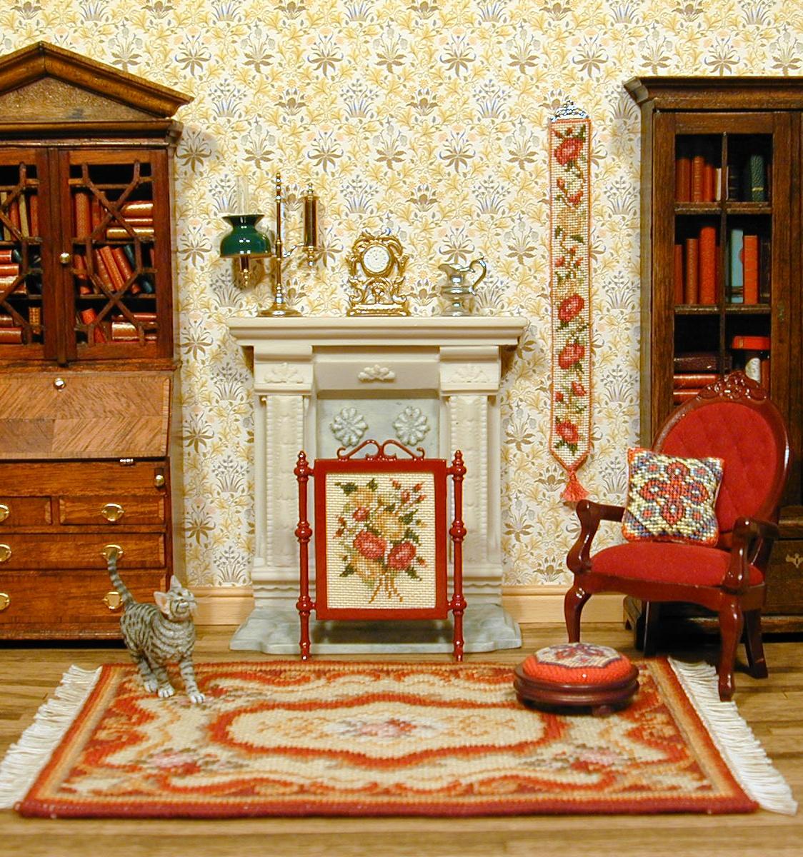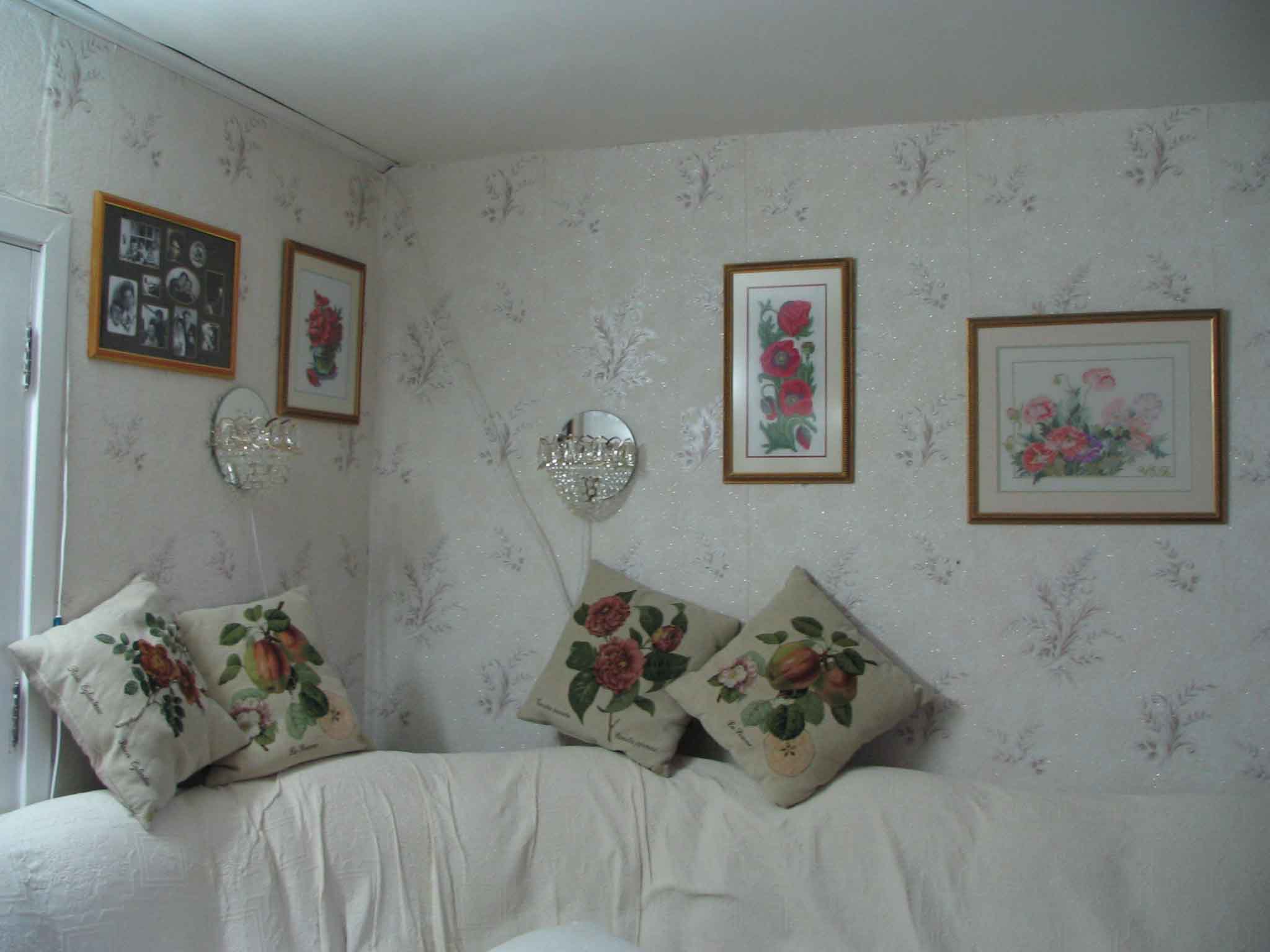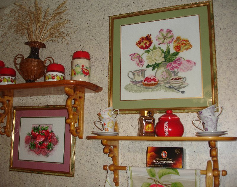 Bordados con almohadas de flores, ataúdes, varias alfombras o fundas de muebles son ideales para la sala de estar. En el estudio, la sala de estar está separada del dormitorio por una red divisoria de madera o plástico, el patrón en el que puede cambiar al menos cada fin de semana. Las cortinas decoradas con dobladillo calado se ven bien. Si el área de comedor se encuentra aquí, entonces un mantel bordado, posavasos calientes será muy útil. Los temas más comunes: un jarrón de frutas, un ramo de flores, un sendero en el bosque, una puesta de sol en el mar. Los amantes crean dípticos y trípticos peculiares: el diseño de una pared con dos o tres pinturas, unidas por una trama común.