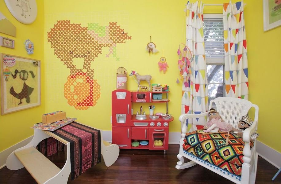 La sala para niños está decorada con bordados con imágenes de personajes de dibujos animados favoritos. Una linda lámpara de noche con una pantalla con la imagen de los animales hará las delicias del bebé. El diseño romántico de almohadas, cortinas, colchas con cintas de tonos delicados atraerá a una niña romántica de más de diez años, un adolescente usará pinturas en blanco y negro, azul-rojo que representan automóviles, motocicletas, artilugios, animales. A los niños muy pequeños les gustará una variedad de bordados brillantes, niños pequeños: formas geométricas, letras, números, palabras. Los juguetes bordados, cestas para ellos, atraerán a los niños de cualquier edad.