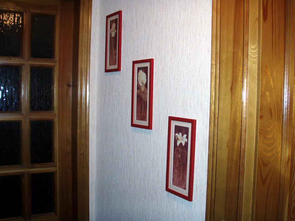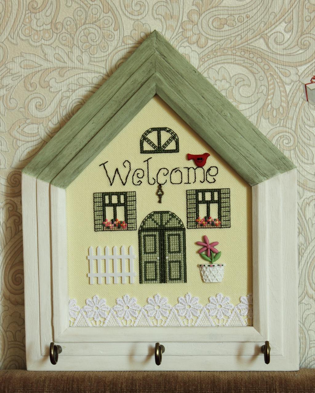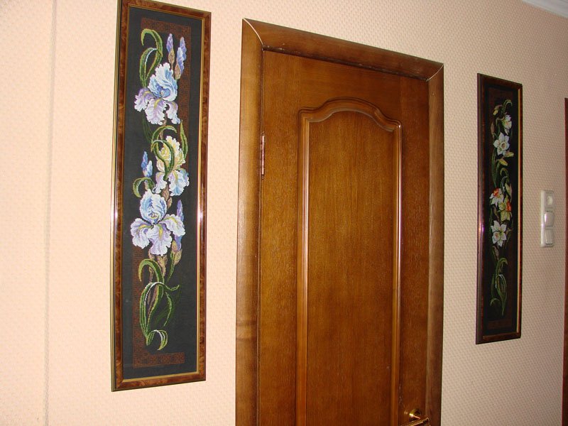 El corredor es el primer lugar que ven todos los que vienen a la casa. Aquí se colocan saludos bordados, perchas elegantes, llaveros decorados con bordados. Varios pequeños paneles con adornos florales encajan perfectamente en la decoración general de la sala. Si no hay ventanas en el pasillo, una imagen de una ventana en miniatura con una hermosa vista desde ella expandirá visualmente ligeramente la habitación. Las cortinas opacas bordadas con temas fantásticos pueden separar el pasillo de la sala de estar en el estudio o pueden ubicarse en una o más puertas. Los recuerdos bordados se colocan en los estantes, y un organizador textil conveniente con bordados es adecuado para guardar peines, pequeños accesorios cosméticos.
