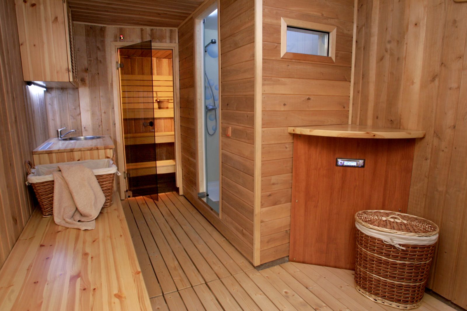 La sala se divide en dos partes: en una de ellas habrá una sala de vapor, una estufa, una caldera con agua. Los estantes están montados aquí, las paredes están forradas de madera, la estufa generalmente se instala por separado del espacio principal. La segunda parte es el vestidor. Acomodará un vestidor, ducha, una mesa con sillas o bancos, un refrigerador con bebidas, comida. Las ventanas son pequeñas, una en cada habitación, están montadas en persianas, cortinas comunes.