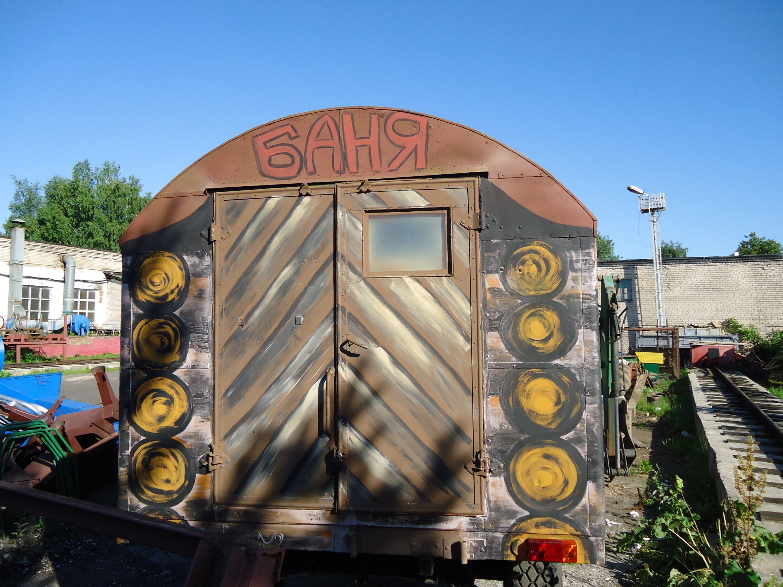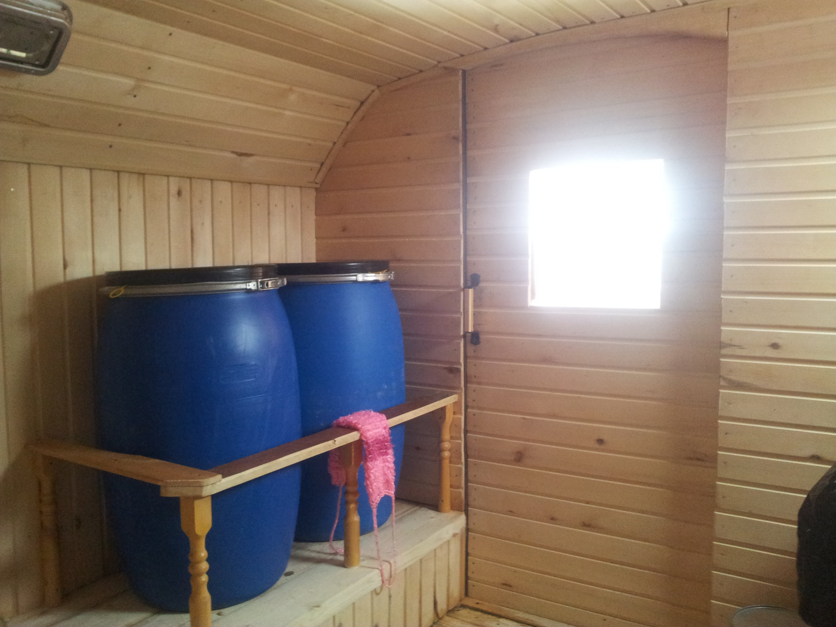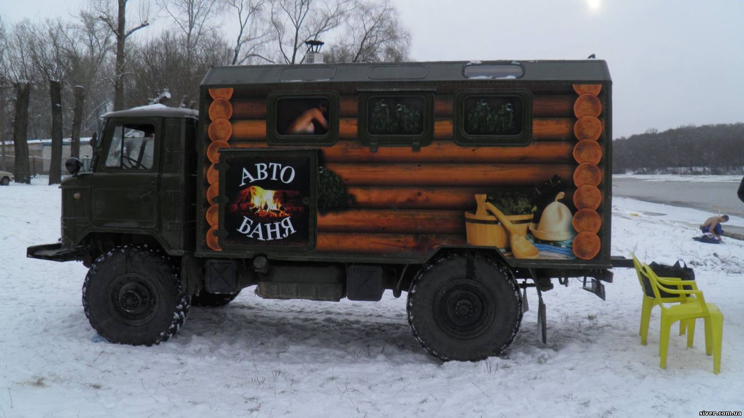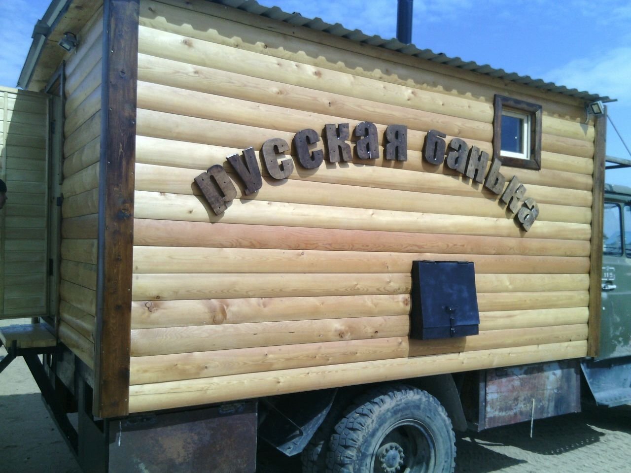 Se coloca una espaciosa casa de baños en el autobús, que debe rehacerse de antemano, para aislar, golpear con papel de aluminio, paneles de madera, y ya hay una escalera en ella. La sala se divide en un vestidor, sala de vapor y otras salas de servicios públicos: la cantidad de espacio lo permite. Se instala un barril comprado en la parte trasera del camión o se construye un remolque; la estructura se debe fijar cuidadosamente con eslingas de sujeción especiales. Para levantar, se hace una escalera plegable, generalmente de madera.