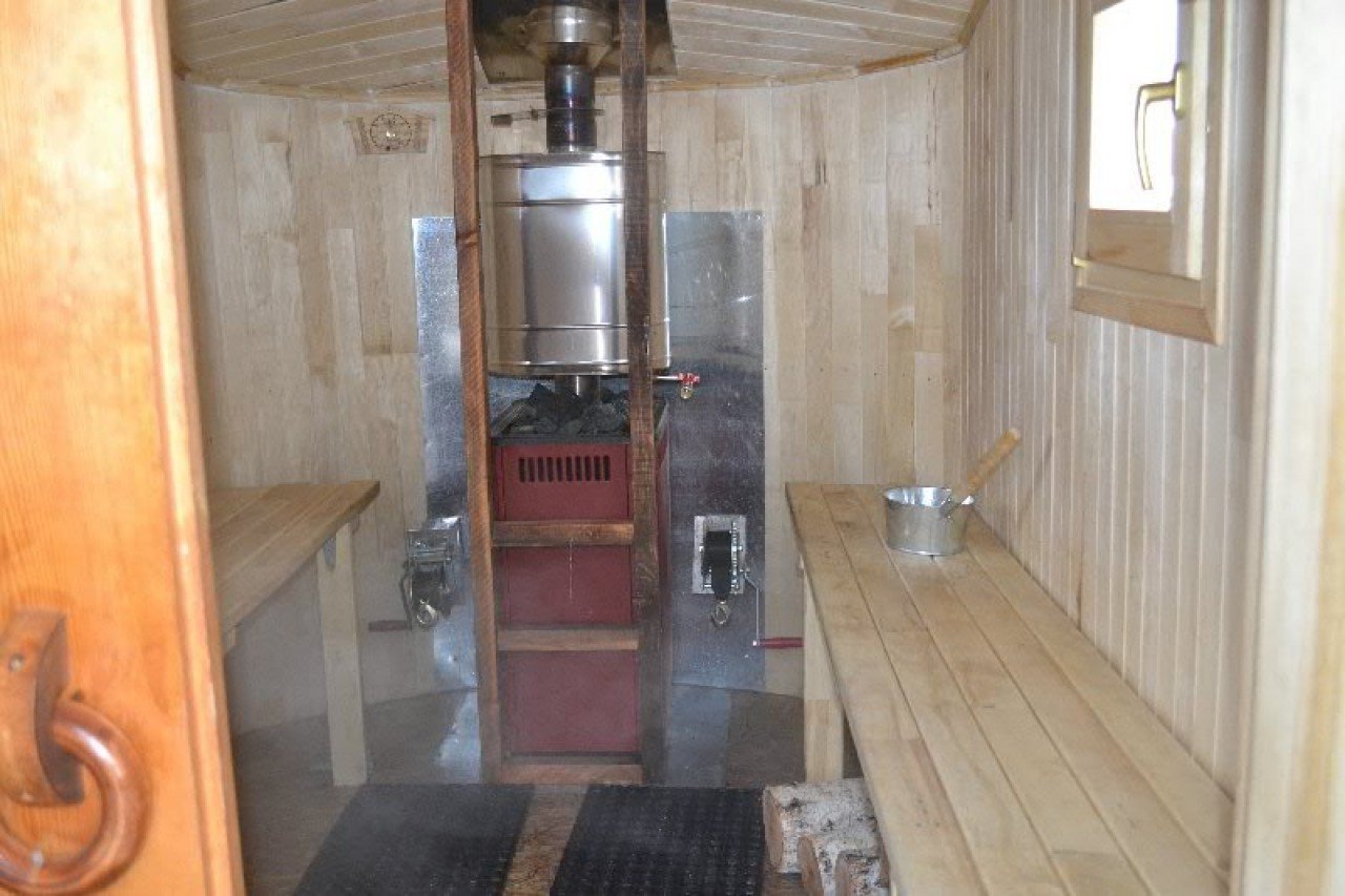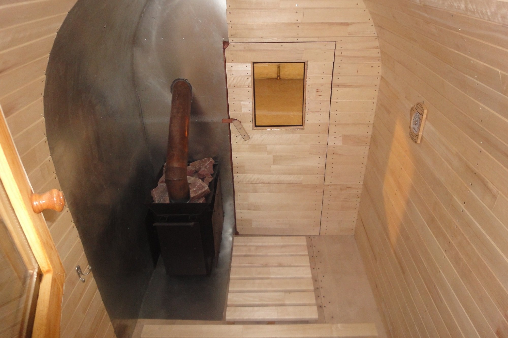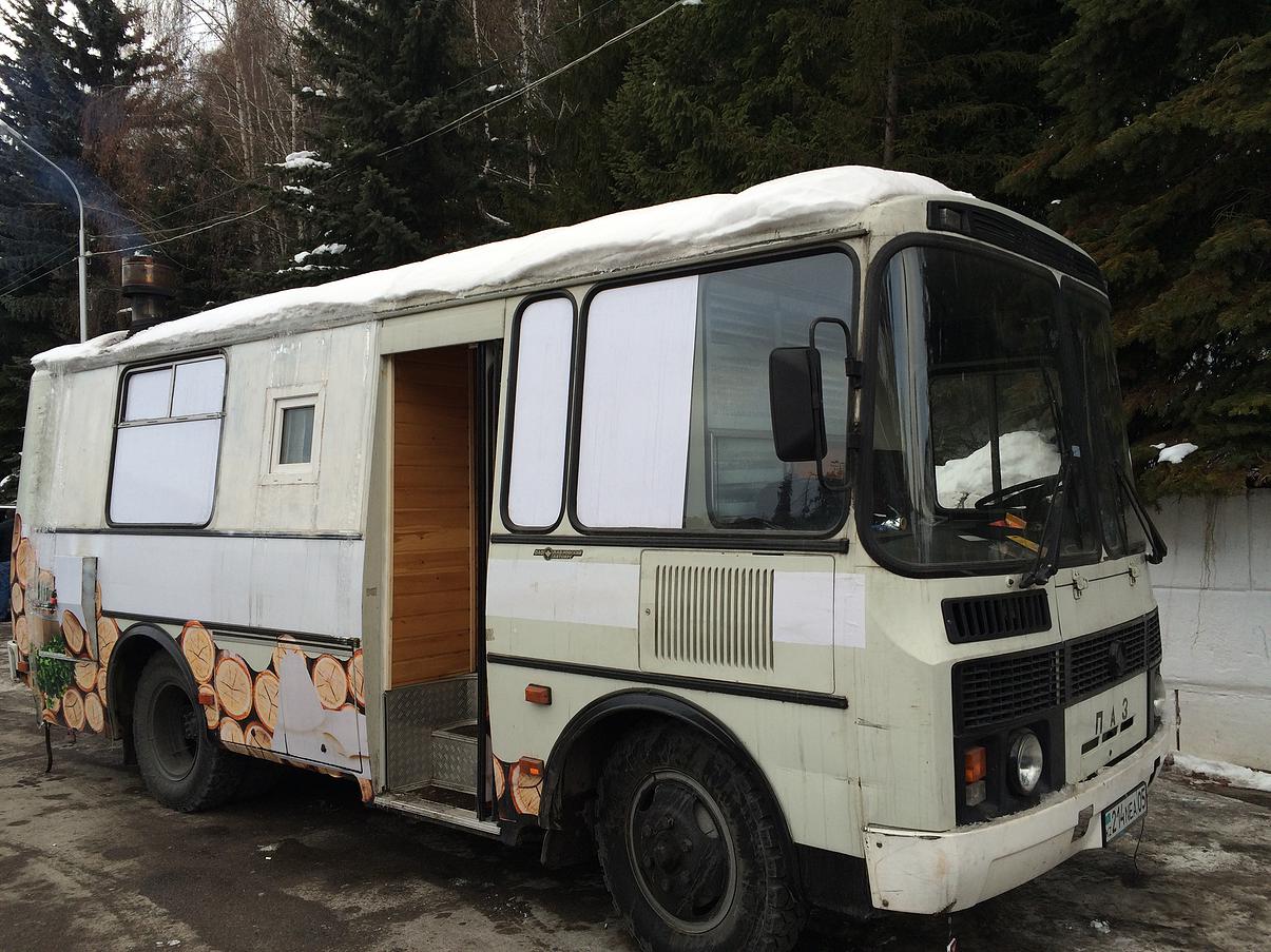 Se coloca una espaciosa casa de baños en el autobús, que debe rehacerse de antemano, para aislar, golpear con papel de aluminio, paneles de madera, y ya hay una escalera en ella. La sala se divide en un vestidor, sala de vapor y otras salas de servicios públicos: la cantidad de espacio lo permite. Se instala un barril comprado en la parte trasera del camión o se construye un remolque; la estructura se debe fijar cuidadosamente con eslingas de sujeción especiales. Para levantar, se hace una escalera plegable, generalmente de madera.