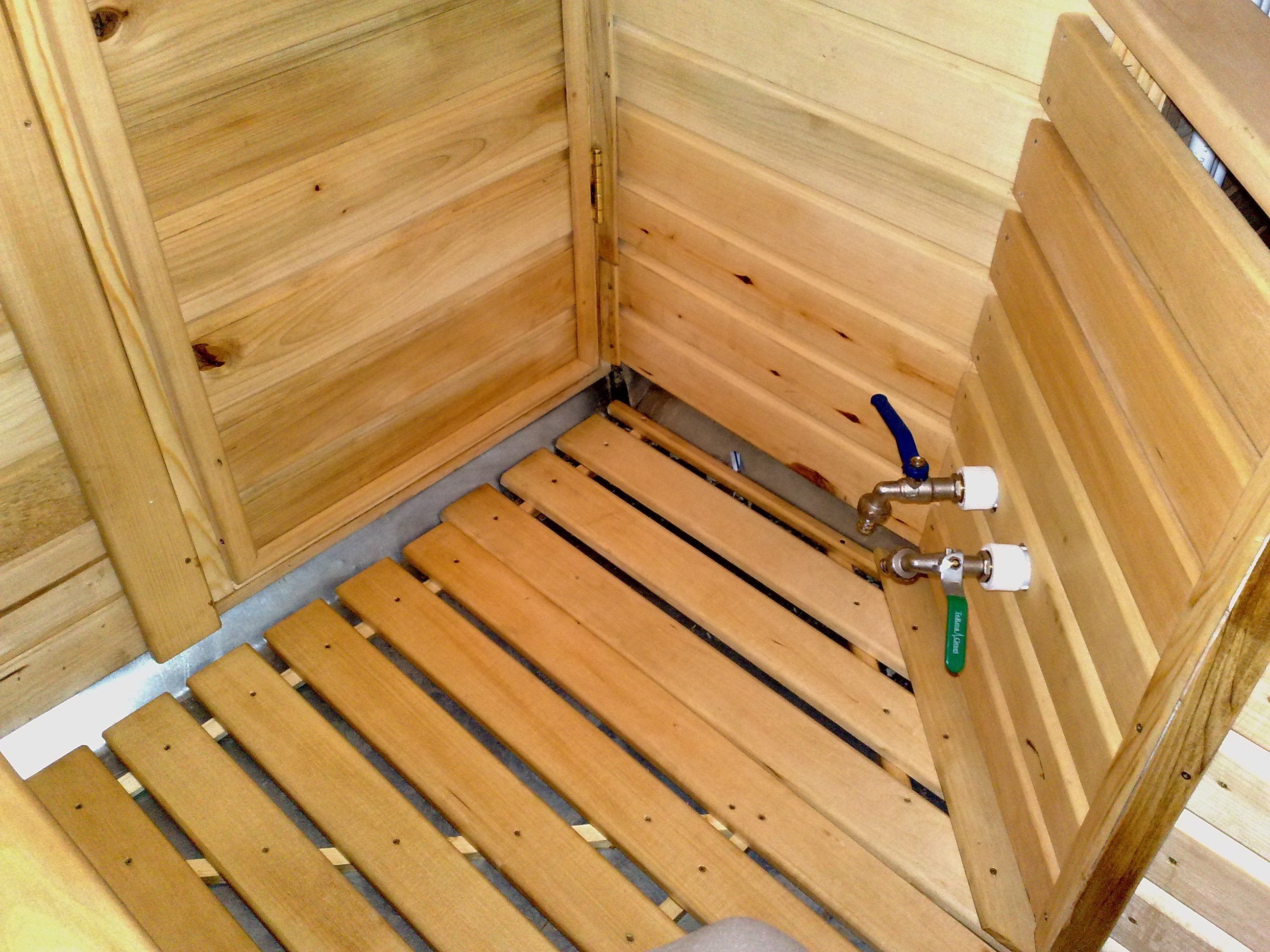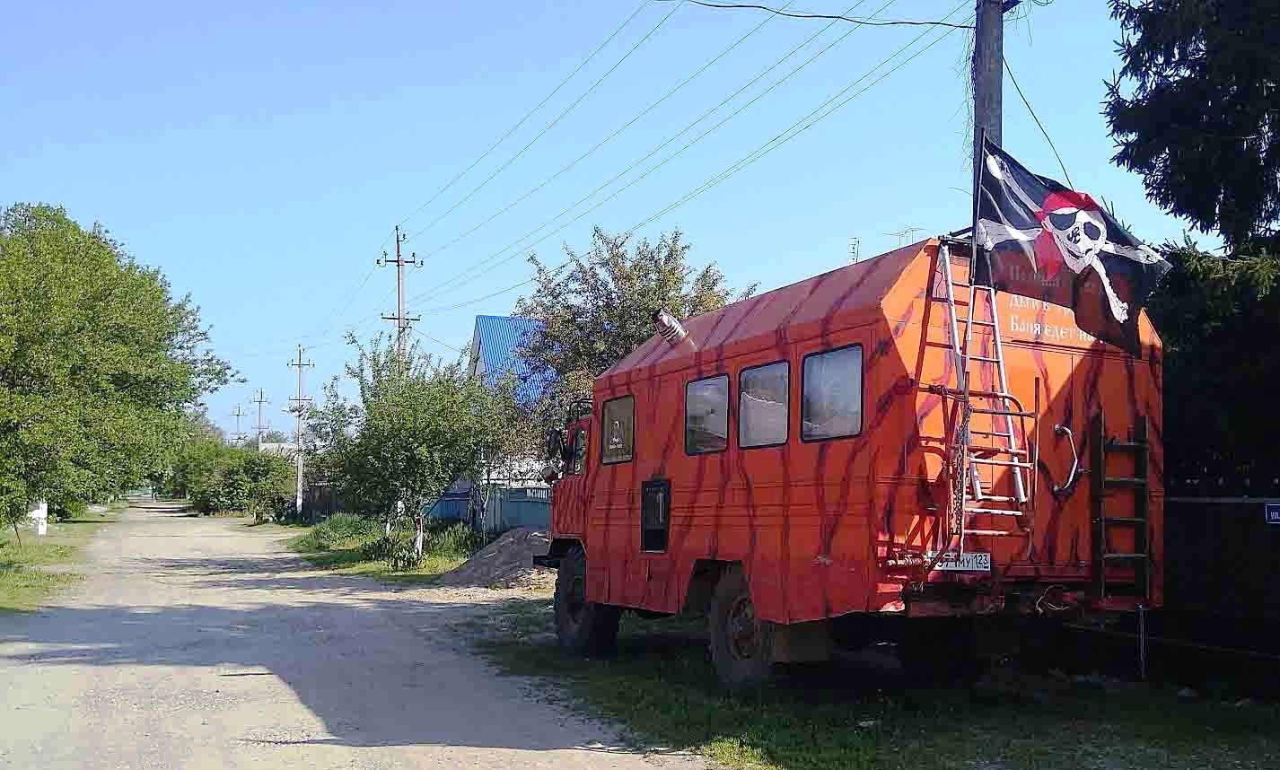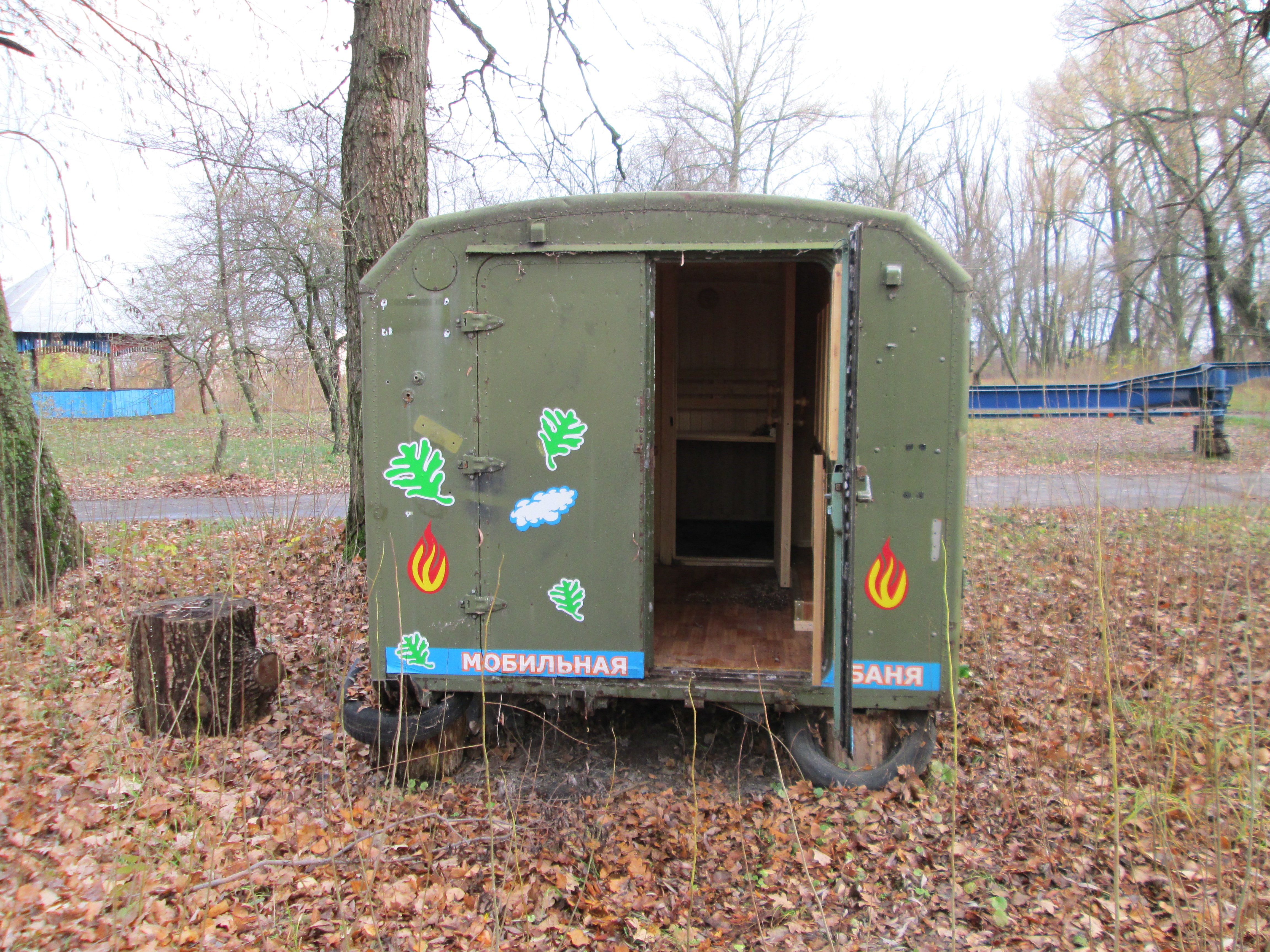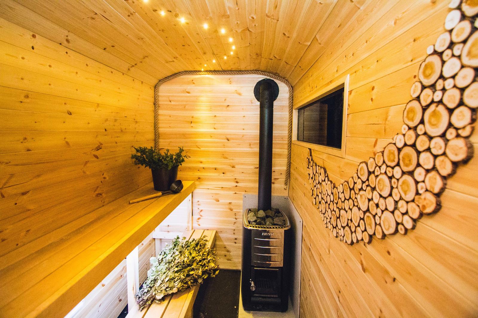 Se coloca una espaciosa casa de baños en el autobús, que debe rehacerse de antemano, para aislar, golpear con papel de aluminio, paneles de madera, y ya hay una escalera en ella. La sala se divide en un vestidor, sala de vapor y otras salas de servicios públicos: la cantidad de espacio lo permite. Se instala un barril comprado en la parte trasera del camión o se construye un remolque; la estructura se debe fijar cuidadosamente con eslingas de sujeción especiales. Para levantar, se hace una escalera plegable, generalmente de madera.