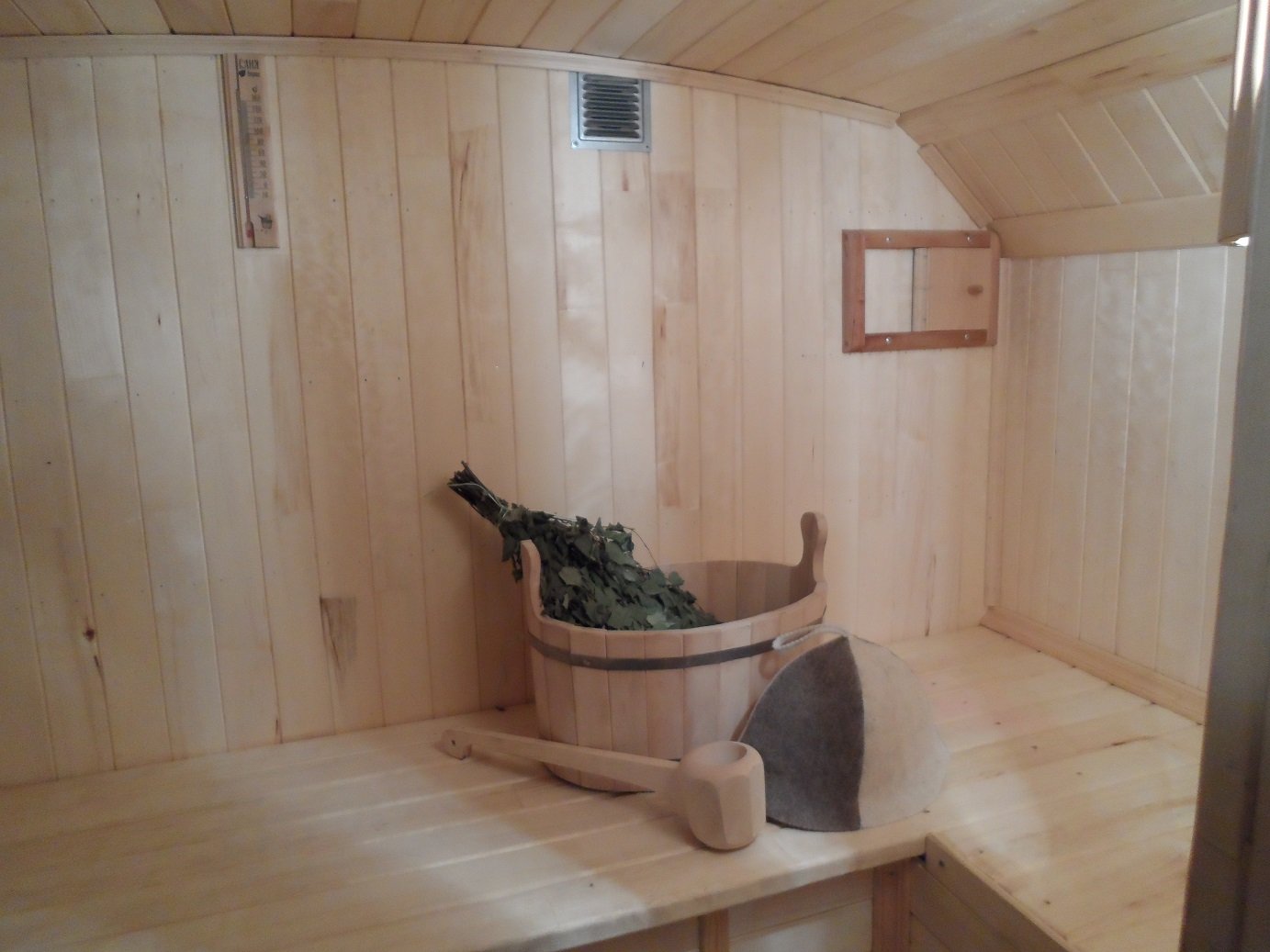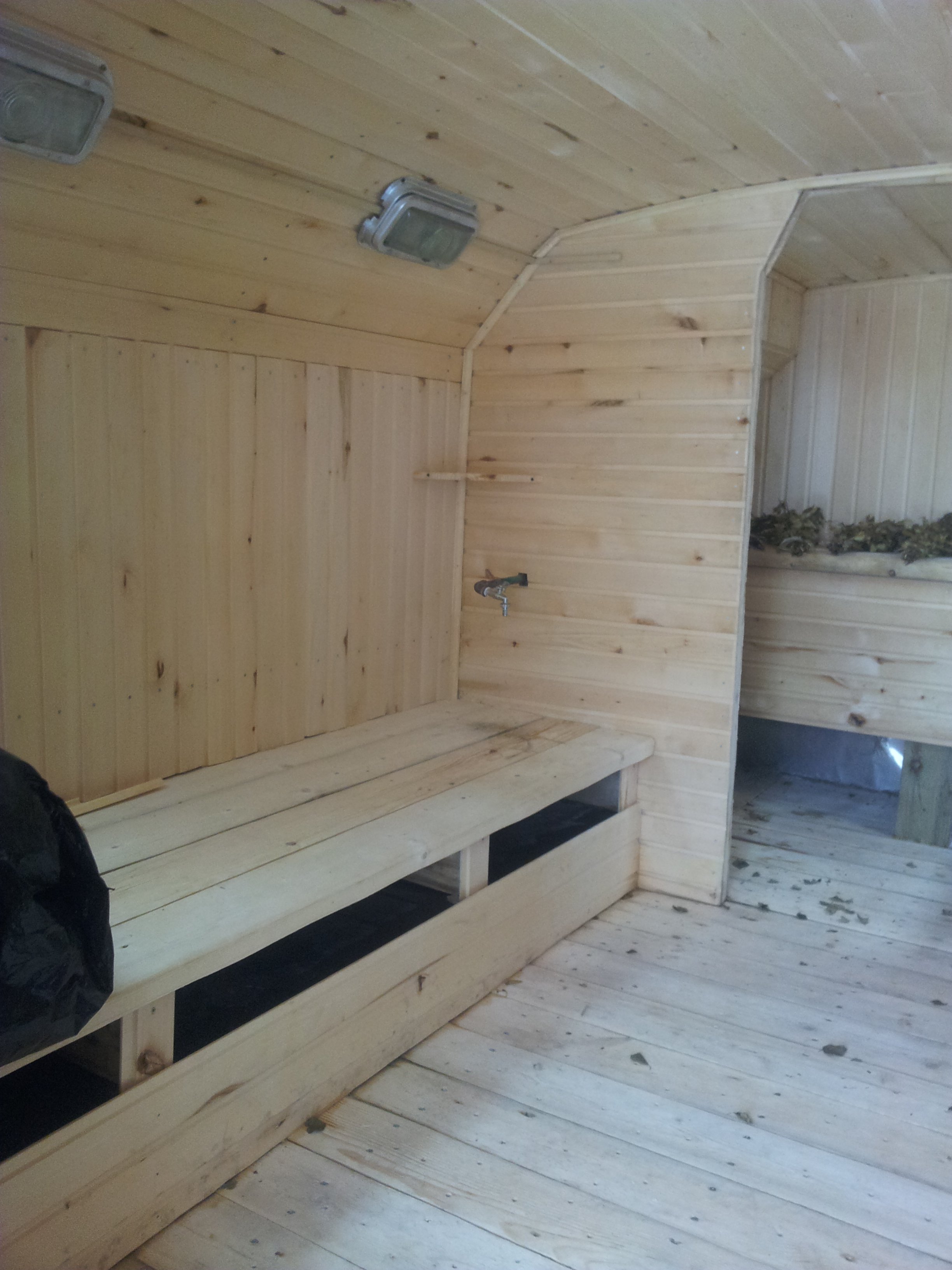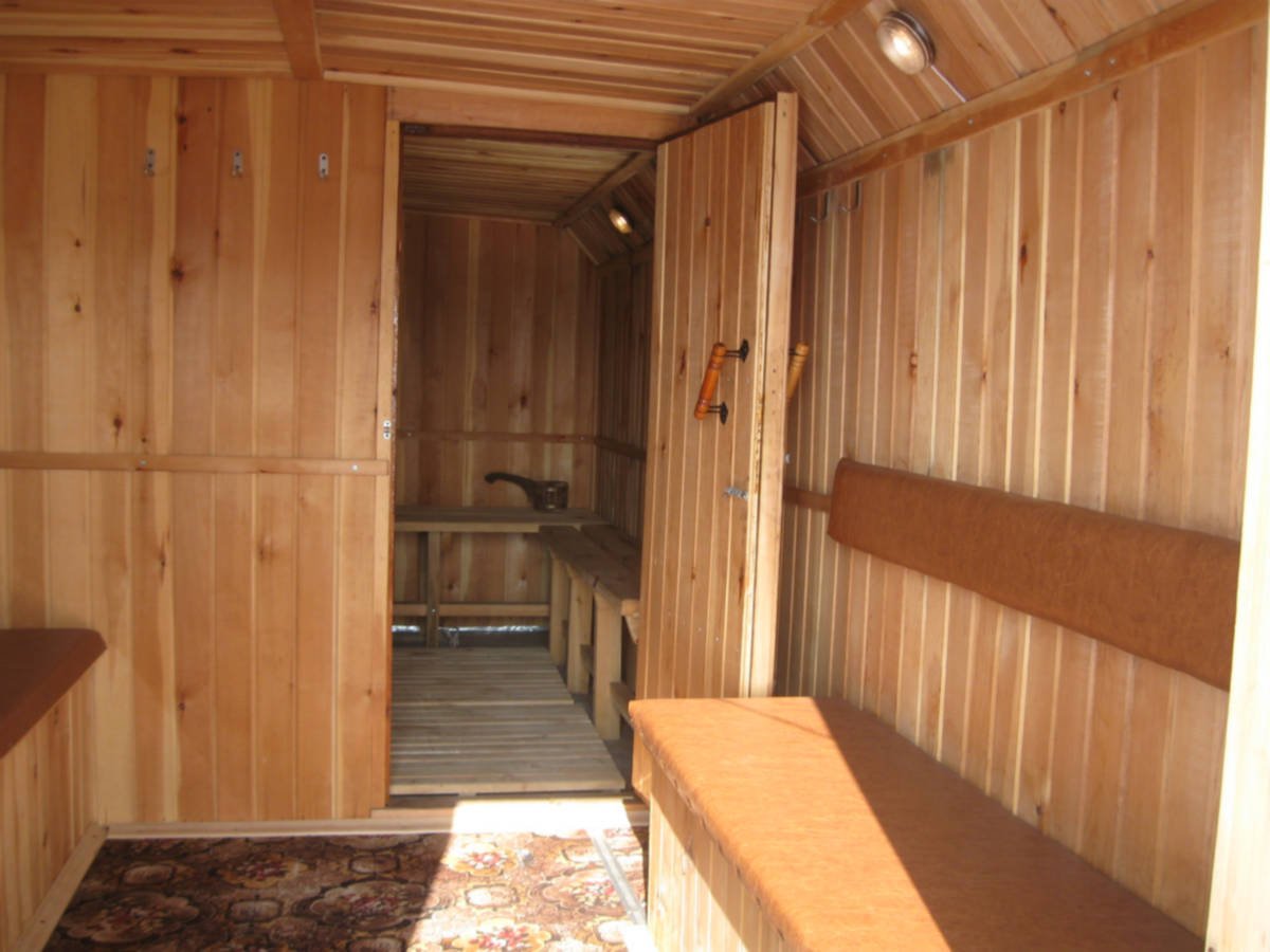 La etapa final es la creación de un interior cómodo y atractivo. Los techos son anchos, como opción: plegables. Necesariamente se necesita al menos un banco, barriles de agua fría y caliente. Para la comodidad de los vacacionistas, es recomendable organizar una ducha y un inodoro. El resto de los muebles, TV, nevera, bar están hechos si hay espacio para ellos. Bancos, estantes están montados a lo largo de las paredes.