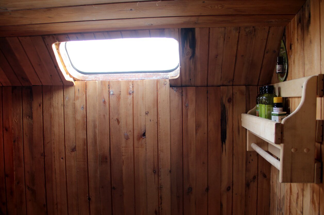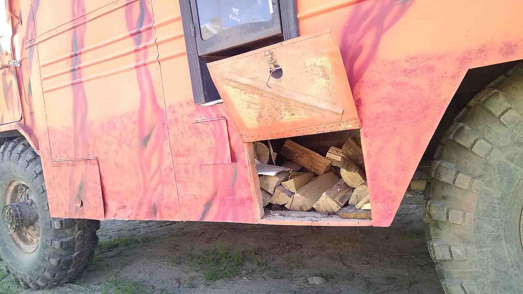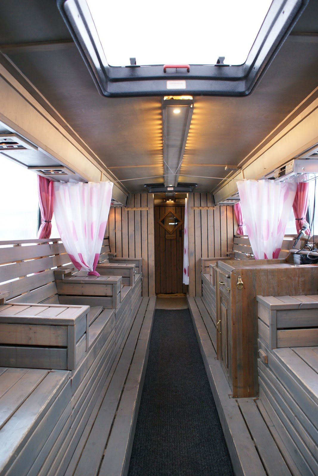 Se coloca una espaciosa casa de baños en el autobús, que debe rehacerse de antemano, para aislar, golpear con papel de aluminio, paneles de madera, y ya hay una escalera en ella. La sala se divide en un vestidor, sala de vapor y otras salas de servicios públicos: la cantidad de espacio lo permite.