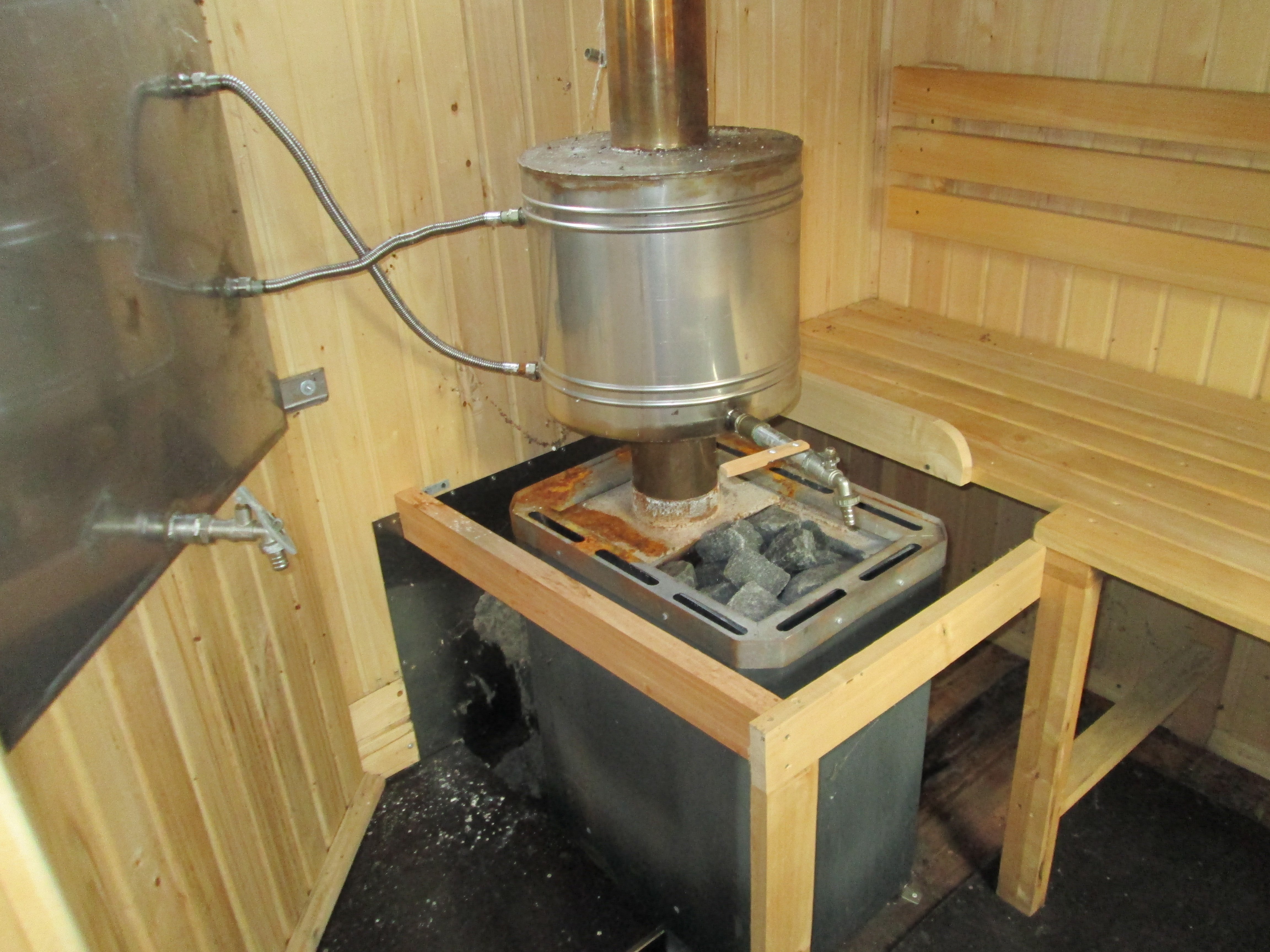 De los materiales de acabado para uso exterior cedro, alerce, álamo temblón. Para la decoración de interiores, son adecuados el abedul, el tilo y muchas otras maderas duras. La lana mineral es adecuada como calentador; el piso es de madera. La habitación se calienta con electricidad, gas o madera común.Para una habitación pequeña, es adecuada una estufa de metal compacta con una potencia de 4.5 kW, en una más espaciosa, de al menos 13 kW. La chimenea está equipada con una válvula, también es necesaria la organización de la ventilación en la parte inferior del horno. El tanque para calentar el agua se selecciona según el número estimado de usuarios de baño presentes al mismo tiempo. Su capacidad es de 50 a 110 litros. El agua se calienta de una de dos maneras: instalando el tanque en la tubería o en forma de registro de tanque. En la primera realización, el agua hierve, aumentando la humedad en la habitación. El segundo es más costoso, complejo, pero el tanque está montado en cualquier lugar, incluso fuera de la sala de vapor. El tanque de agua fría se hace muy voluminoso, de 100 a 500 litros.