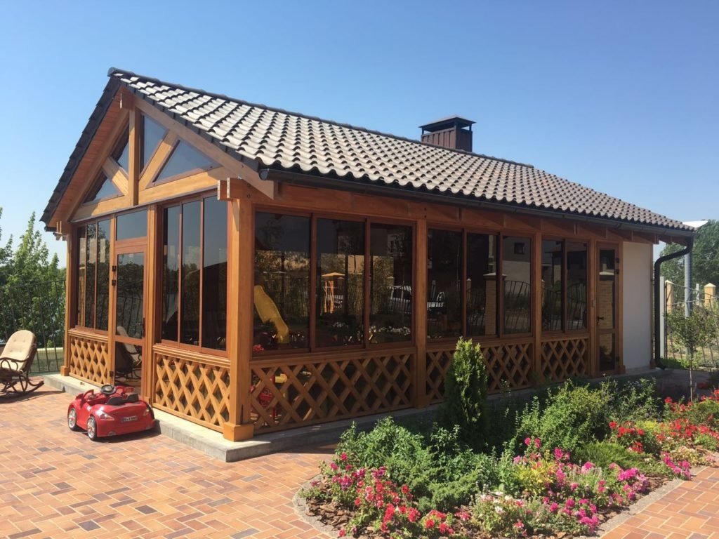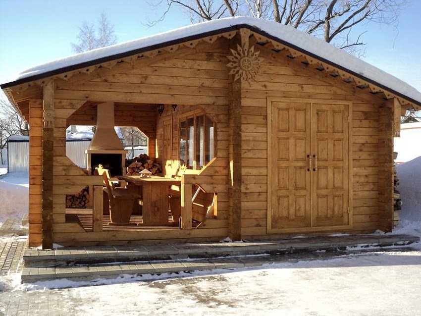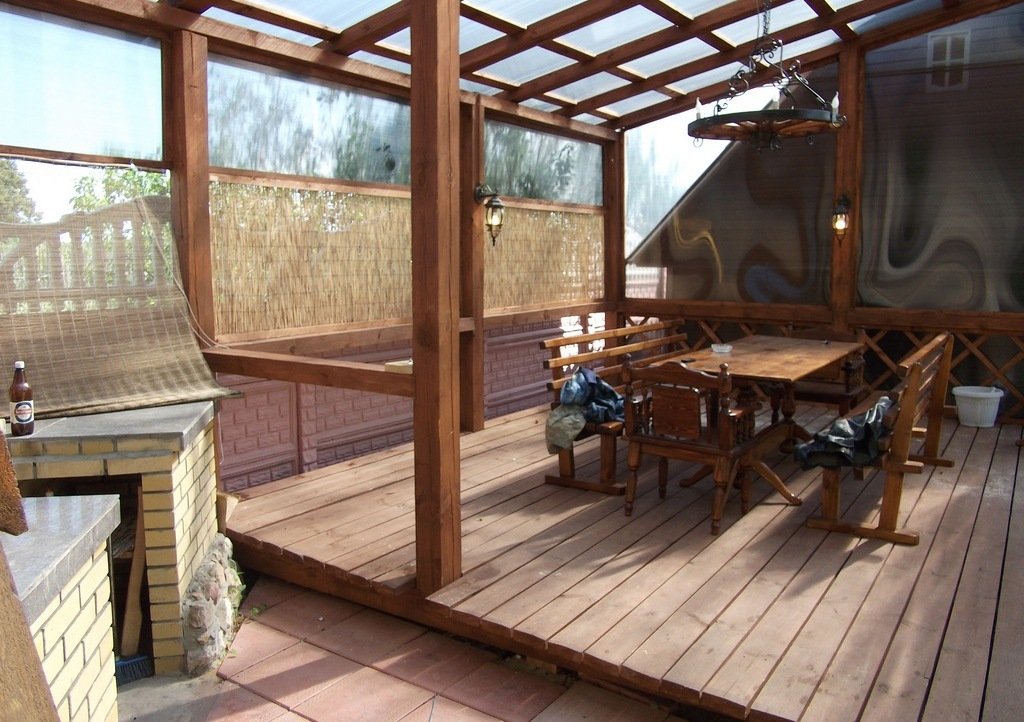 El objeto, por sentido, es una cocina completa con electricidad y agua corriente. La terraza dará la bienvenida a los huéspedes en verano e invierno, y si lo desea, incluso puede organizar una mini-discoteca allí, dejando a un lado los utensilios de cocina portátiles. Después de instalar la calefacción, la habitación se volverá adecuada para su uso activo en invierno. Para áreas con heladas tempranas o fuertes lluvias frecuentes, una construcción cerrada será la única solución correcta. La glorieta-cocina está equipada con una estufa de ladrillo, electrodomésticos, si es necesario: barbacoa, barbacoa y otros electrodomésticos para las opciones de cocina de verano. El área del comedor y la cocina deben dividirse en dos partes paralelas, entre las cuales habrá un pasaje a la casa de baños.En ausencia de acceso a la red eléctrica, una forma de salir de la situación es comprar un generador.