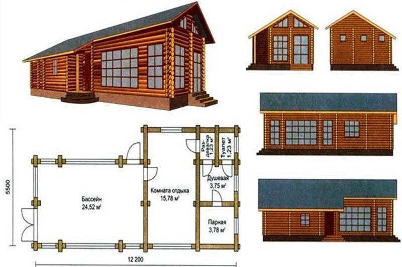 El diseño ideal con una piscina consta de 3 partes. Están dispuestos en una línea, y la piscina será solo el segmento medio. Para evitar reurbanizaciones y costos adicionales, se debe instalar un jacuzzi junto al tanque grande. Cerca de la piscina, hay una sala de relajación, una sala de lavado con baño de vapor, y en el lado opuesto hay una barbacoa y una gran mesa con sillas. Los proyectos de dos pisos a menudo se ofrecen con un grupo. La piscina y el cenador se colocan en la planta baja y, sobre todo, en los baños.En el mercado en este momento, puede encontrar fácilmente opciones de uno y dos pisos para 25, 33, 39, 49, 52, 67, 84, 124 y 145 m². Las dimensiones de los edificios serán 5 × 5, 6.5 × 5, 6.2 × 6.8, 8 × 7, 9.4 × 5.9, 9.5 × 7 m, respectivamente, para una sola planta y 7.8 × 5 , 4, 8.6 × 7.2, 13.3 × 11.7 m - en edificios de dos pisos.
