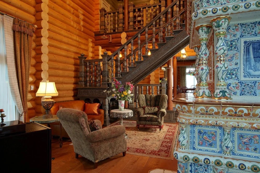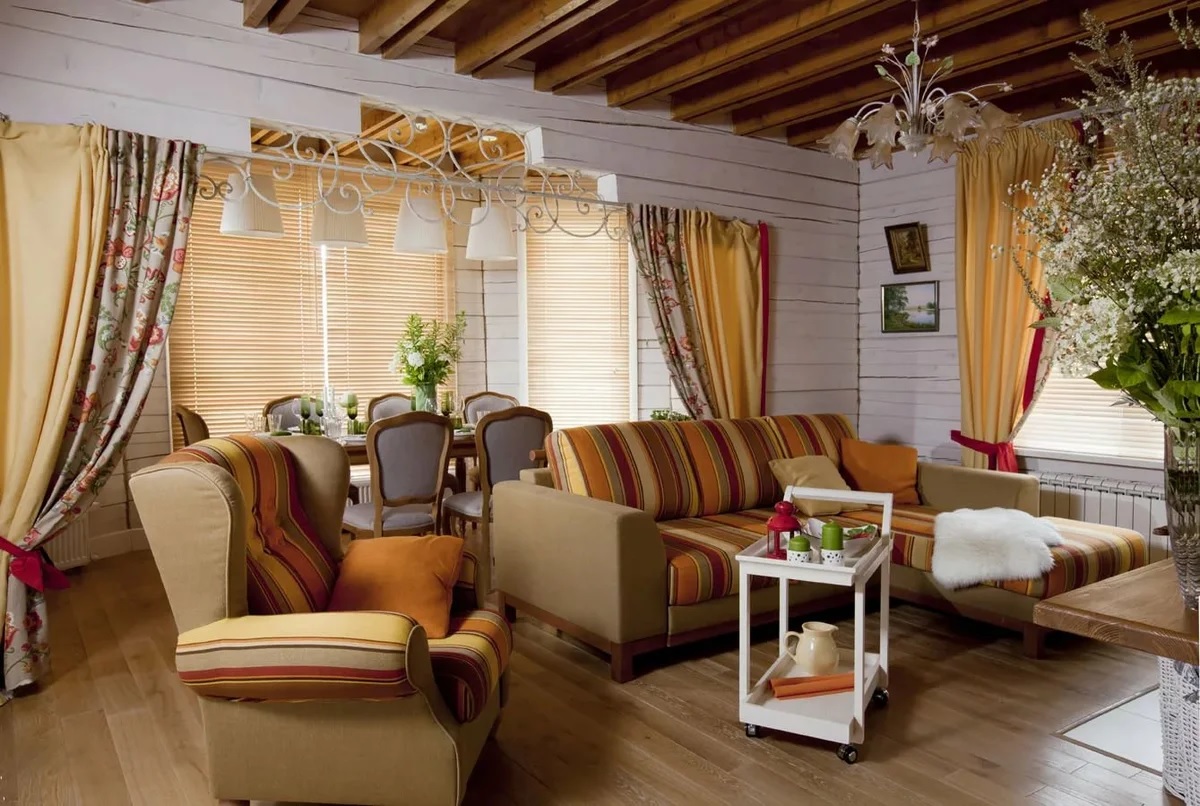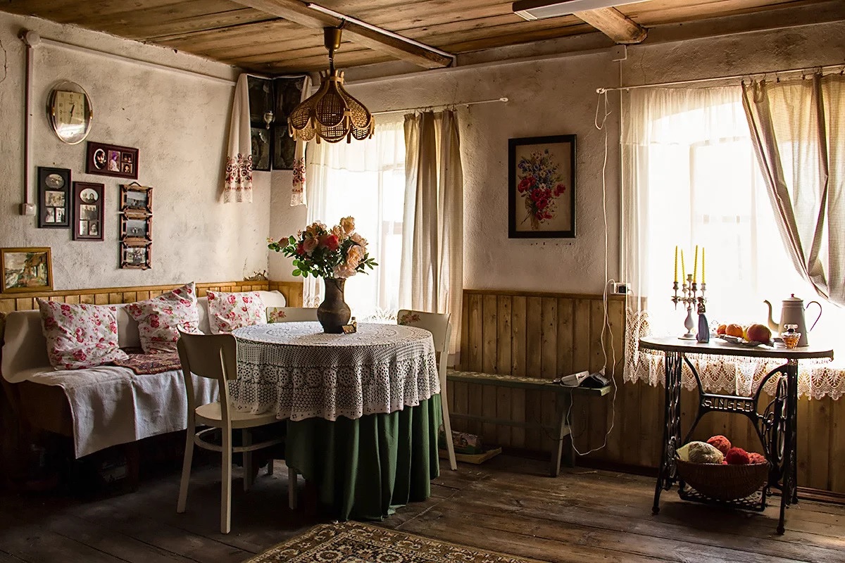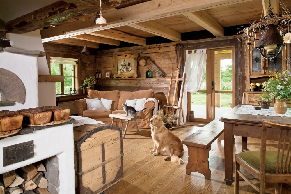 La situación en las zonas rurales modernas no se parece en nada a los museos de artesanías antiguas. Un atributo indispensable es el horno. Está decorado con yeso, pintura, ersatz. El espacio interior debe ser libre, sin apilar muebles. Grandes ventanas abiertas llenan la habitación de luz y enfatizan su amplitud.