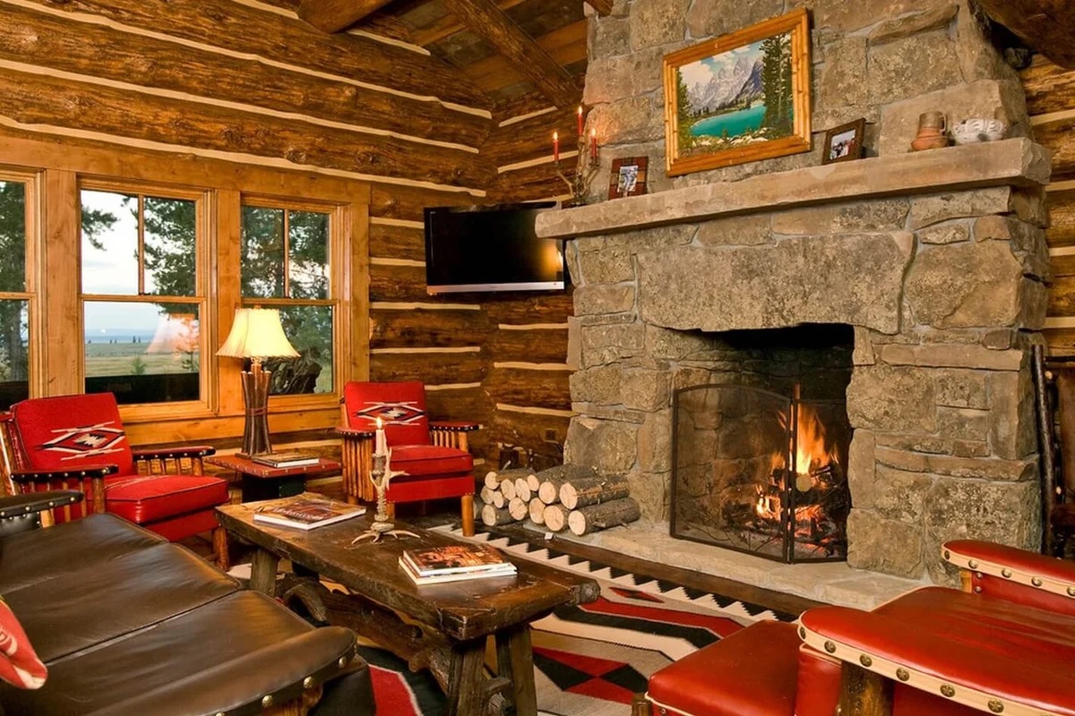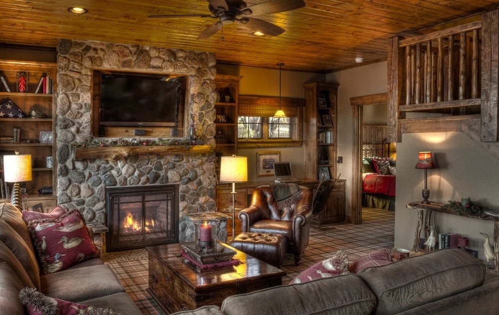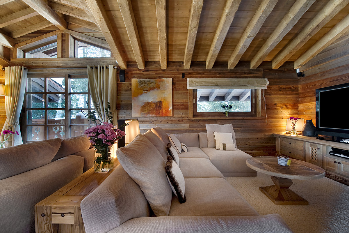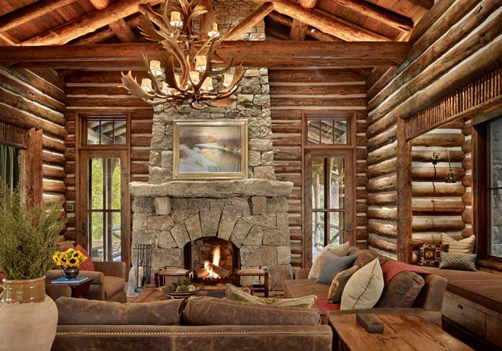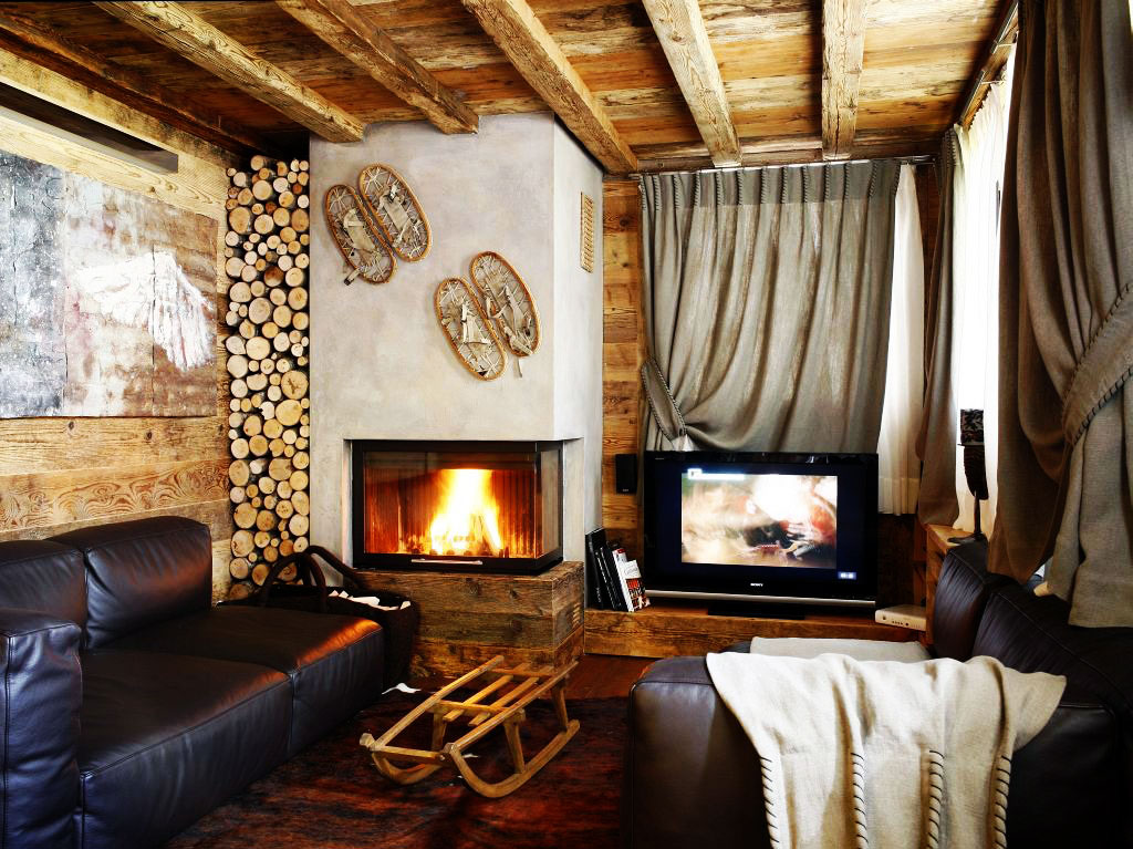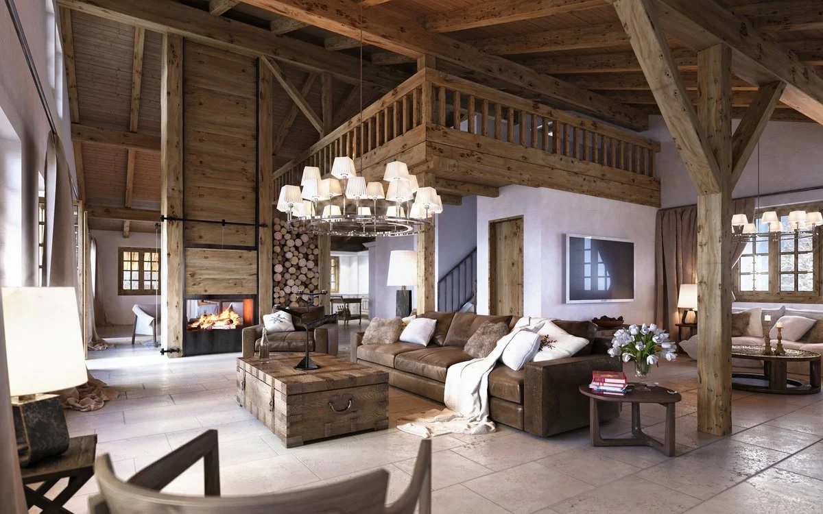Es imprescindible que el chalet use piedra en el interior o su imitación. Acaban los pisos, parcial o completamente, de pared. El mobiliario se elige masivo con tapicería de cuero. El estilo de chalet en la casa de troncos enfatizará la chimenea real con una caja de leña para leña. Algunos muebles pueden envejecerse artificialmente. Esto hará que la habitación sea más habitable. Se excluyen las superficies brillantes y pulidas.