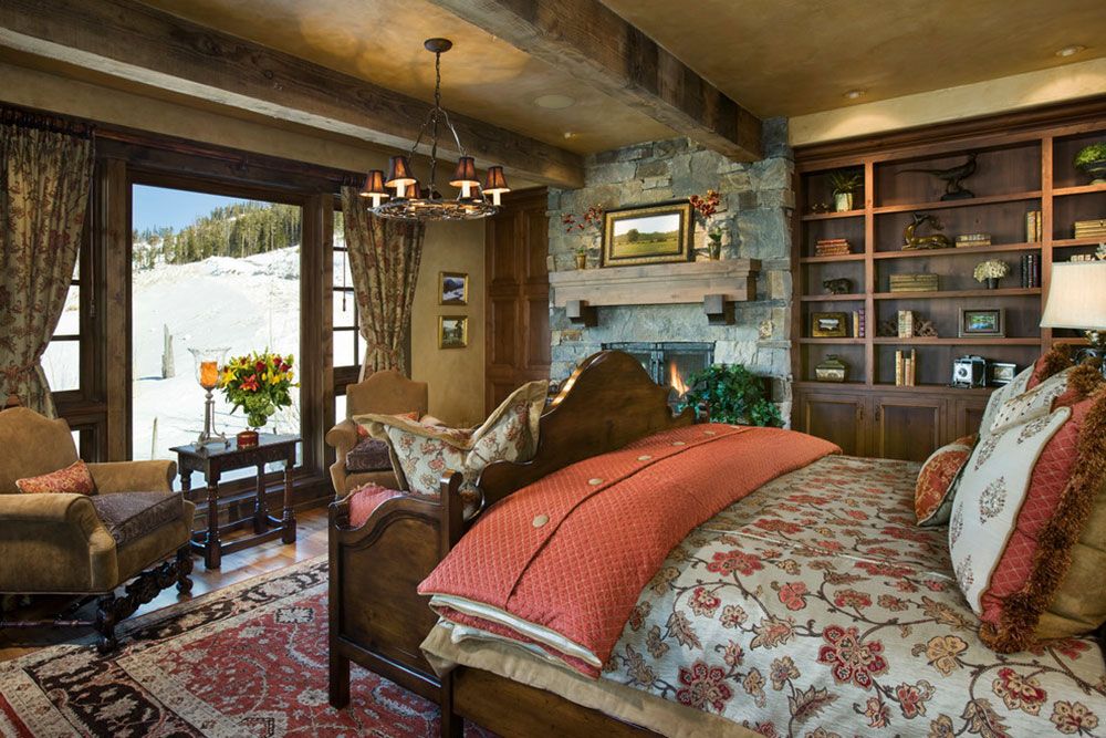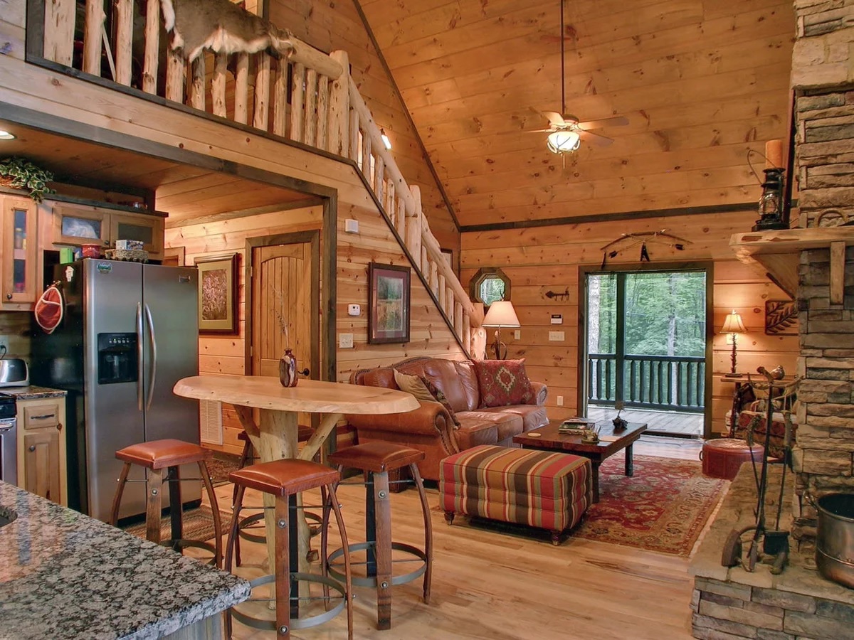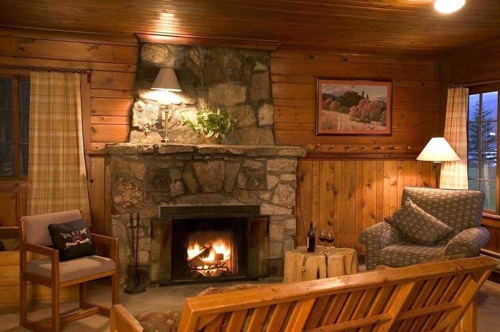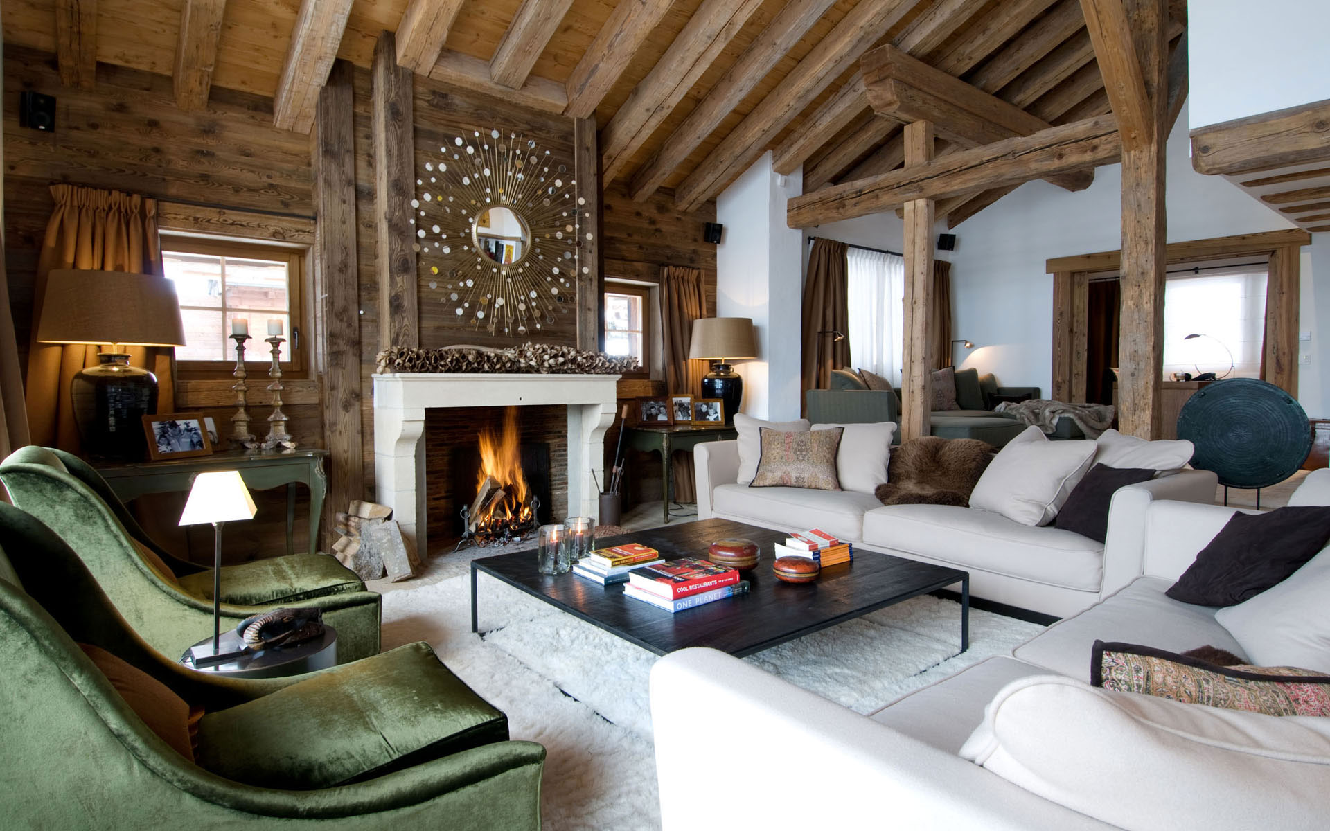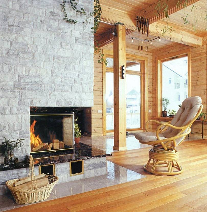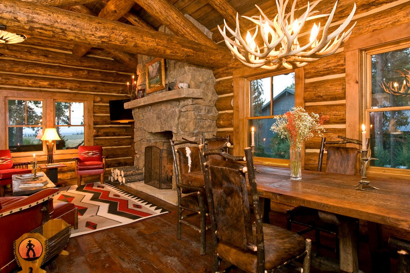 Es imprescindible que el chalet use piedra en el interior o su imitación. Acaban los pisos, parcial o completamente, de pared. El mobiliario se elige masivo con tapicería de cuero. El estilo de chalet en la casa de troncos enfatizará la chimenea real con una caja de leña para leña. Algunos muebles pueden envejecerse artificialmente. Esto hará que la habitación sea más habitable. Se excluyen las superficies brillantes y pulidas.