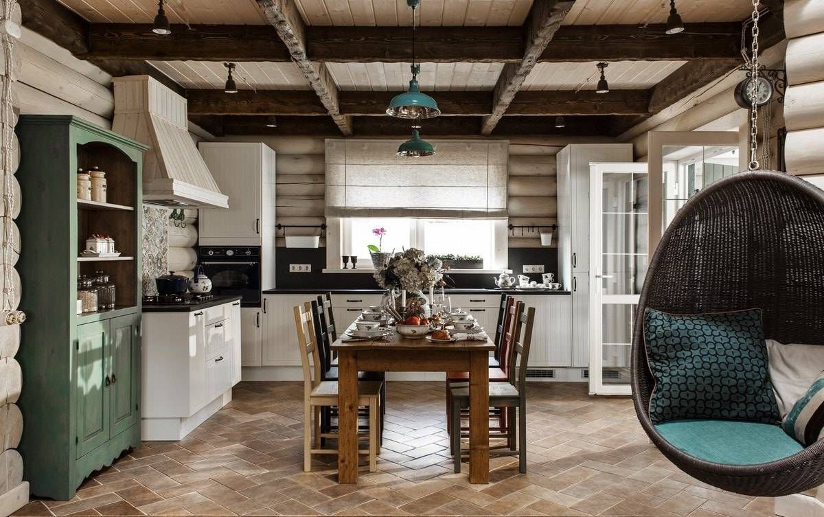 El piso se puede cubrir con cualquier material, lo principal es que es práctico y fácil de limpiar. La superficie está revestida con parquet, linóleo, azulejos, tableros barnizados. Los muebles en la cocina de una casa de madera pueden ser clásicos hechos de madera o modernos, de metal y plástico. Las paredes del comedor están decoradas con cuadros o paneles de materiales naturales.