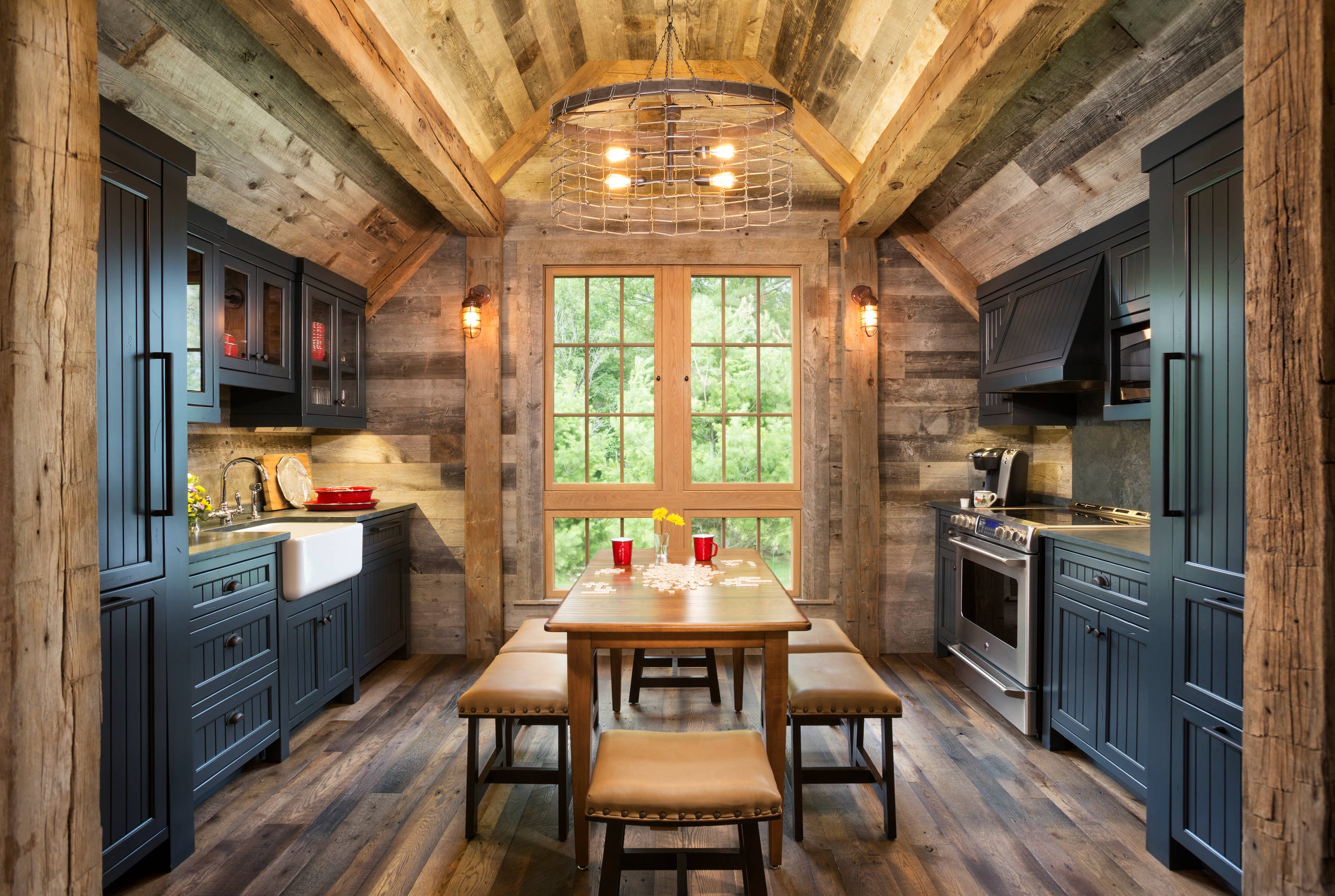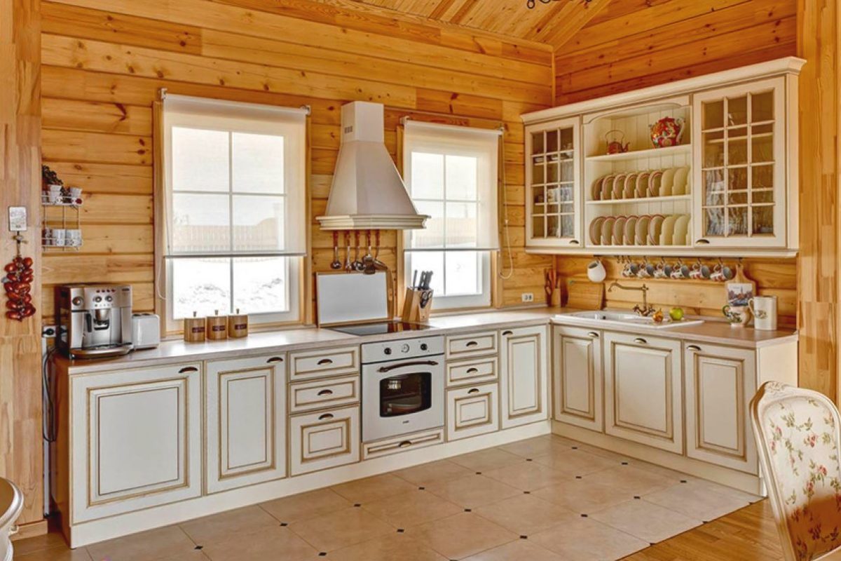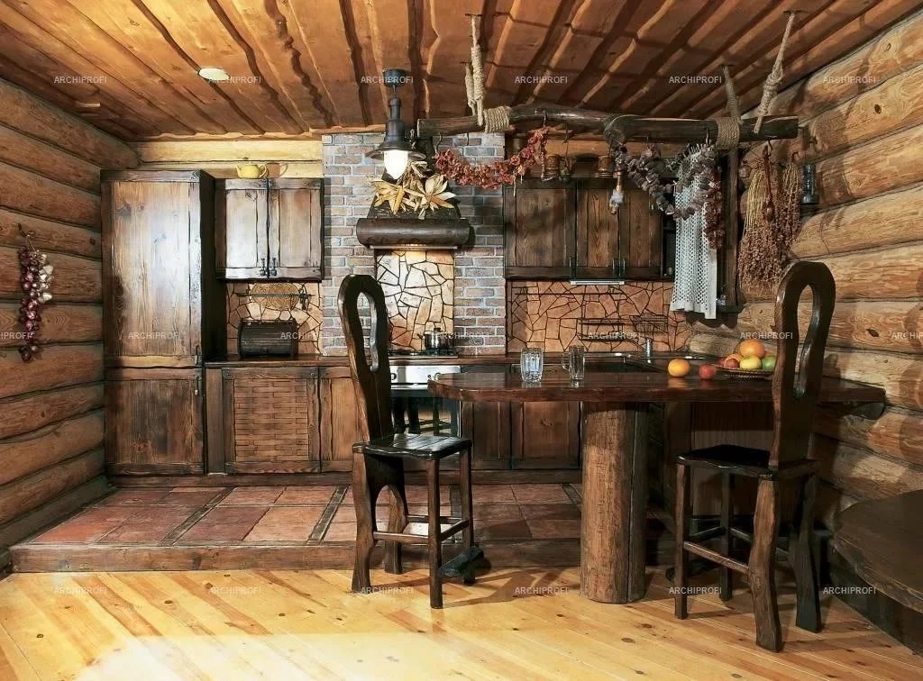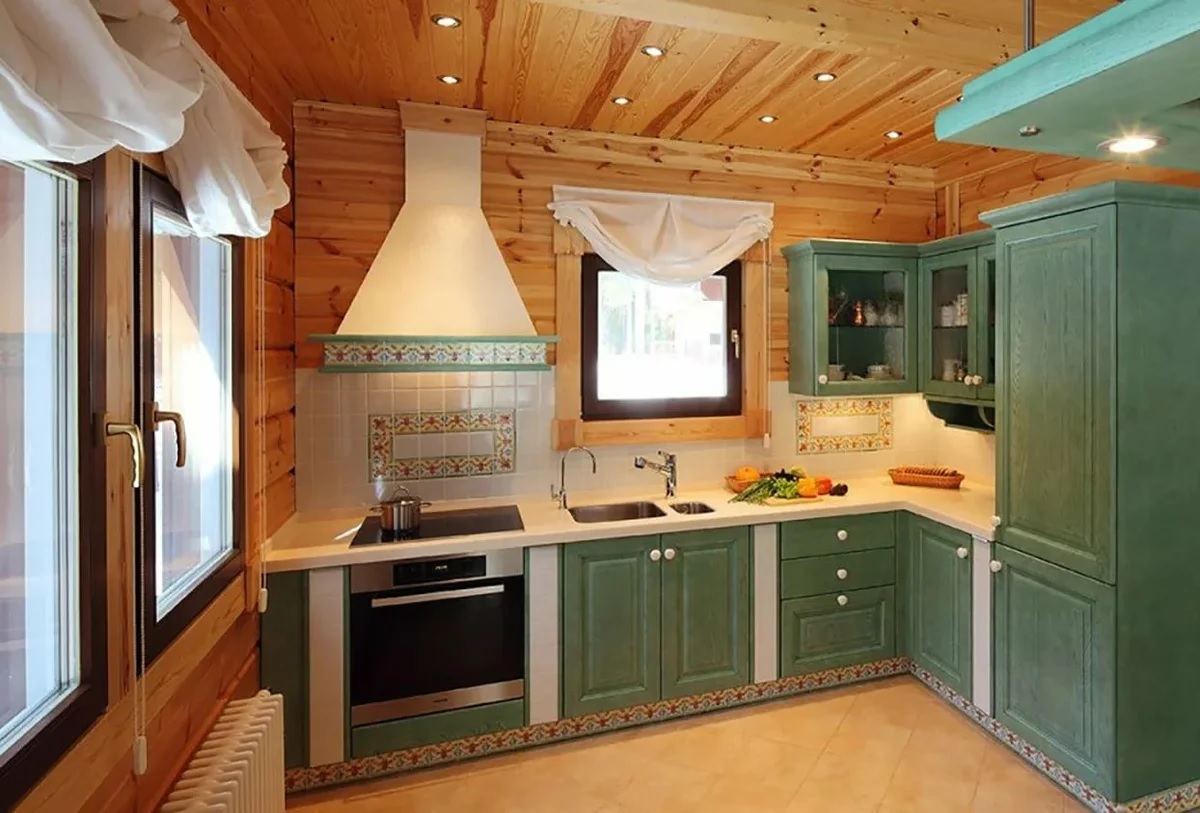 Al planificar el interior, en primer lugar, se tiene en cuenta la ubicación de los electrodomésticos y estufas. La estufa de gas o eléctrica debe estar cerca de la ventana o tener una buena campana extractora. El techo está acabado con placas de yeso o se deja en su forma natural con vigas de madera pronunciadas.