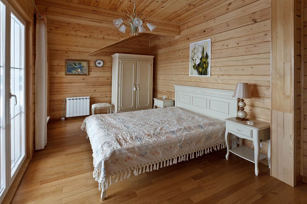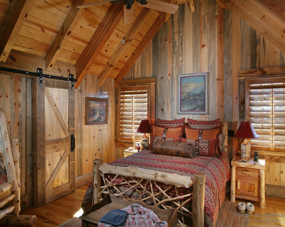 El baño a menudo se encuentra en el segundo piso de una casa de madera. El dormitorio es más pequeño que la sala de estar y debe tener un interior especial.Es mejor hacerlo en un estilo rústico, clásico o rústico. Al elegir un método de acabado, es necesario comprender que la mayor parte posible de la madera natural debe permanecer a la vista.