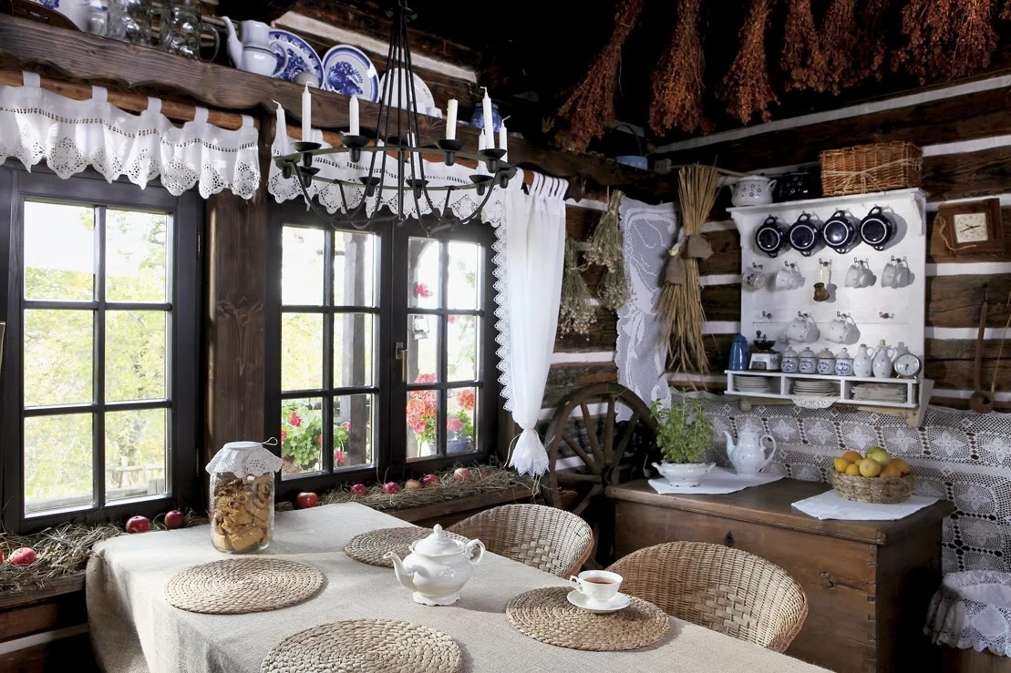 Los artículos hechos a mano encajarán perfectamente como decoración. Esto puede ser un samovar, loza de barro, Khokhloma y otras cosas. Los textiles se usan solo de forma natural. Manteles, toallas, servilletas con bordado a mano.