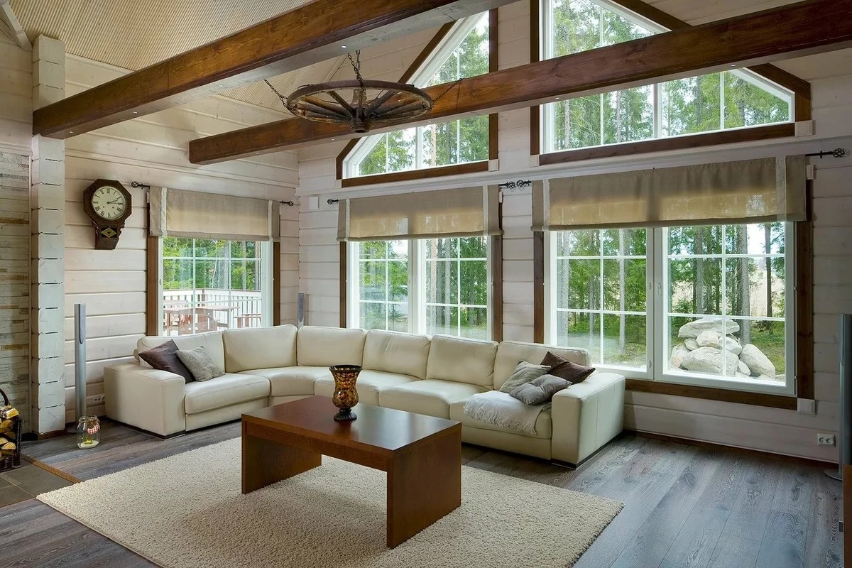 Las casas de madera en estilo escandinavo o loft están hechas con un plan abierto. Ventanas panorámicas, puertas anchas son bienvenidas. Para el revestimiento de paredes y techos, use paneles de plástico anchos y revestidos. Los muebles deben ser prácticos y concisos. Las sillas de mimbre simples se ven bien. Como textiles para ventanas, use cortinas translúcidas, suaves alfombras de sofá de color marrón, azul. Toda la decoración está relacionada con motivos marinos del norte.