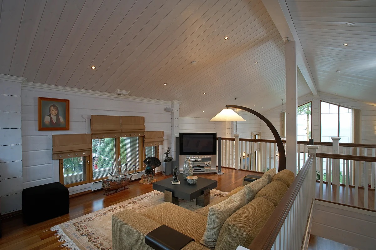 Los interiores finlandeses son prácticos y concisos. El material de acabado tradicional es la madera natural. Tablillas, listones, paneles cubren todas las superficies. Es mejor dar preferencia a las razas ligeras. Esto ampliará el espacio, hará que la habitación sea acogedora. Pinturas originales, almohadas brillantes, alfombras y cortinas diluirán el exceso de blanco.