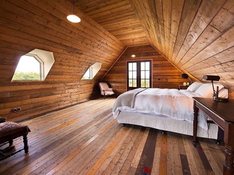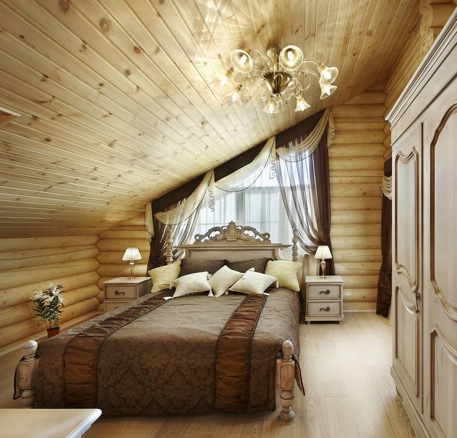 En esta parte de la casa, se puede organizar cualquier habitación elegante, por lo que la decoración se elige en función de su propósito. El techo generalmente está simplemente barnizado o forrado con revestimiento. Si decide equipar el dormitorio, las superficies se pueden pegar con papel tapiz.