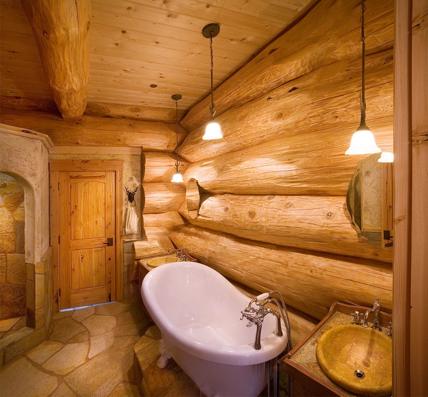 La ducha o el baño se pueden hacer con los materiales habituales. Pero si necesita mantener la armonía del diseño de una casa de madera, puede usar un revestimiento especial de madera con alta humedad. Este acabado se puede combinar con piedra, azulejo, plástico, metal.El revestimiento combinado se usa para extender la vida útil del material base.