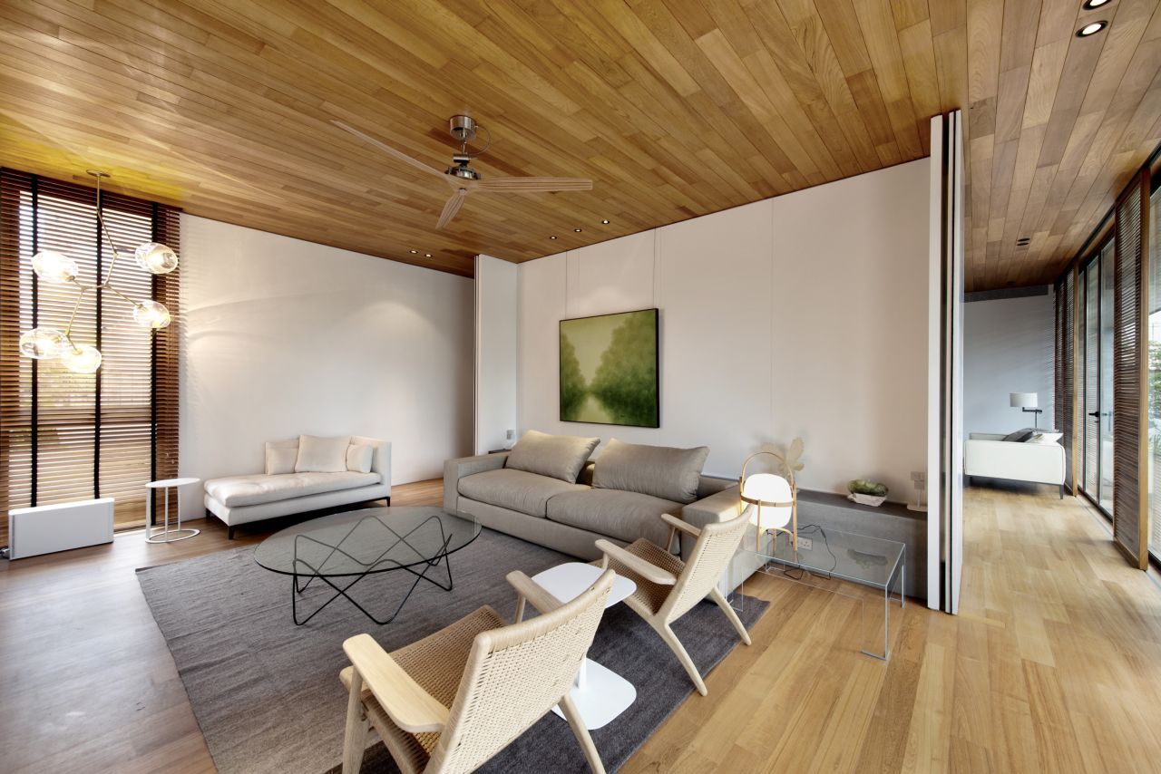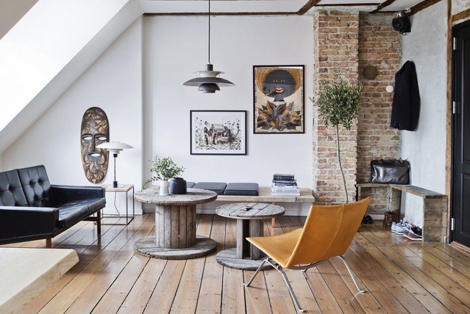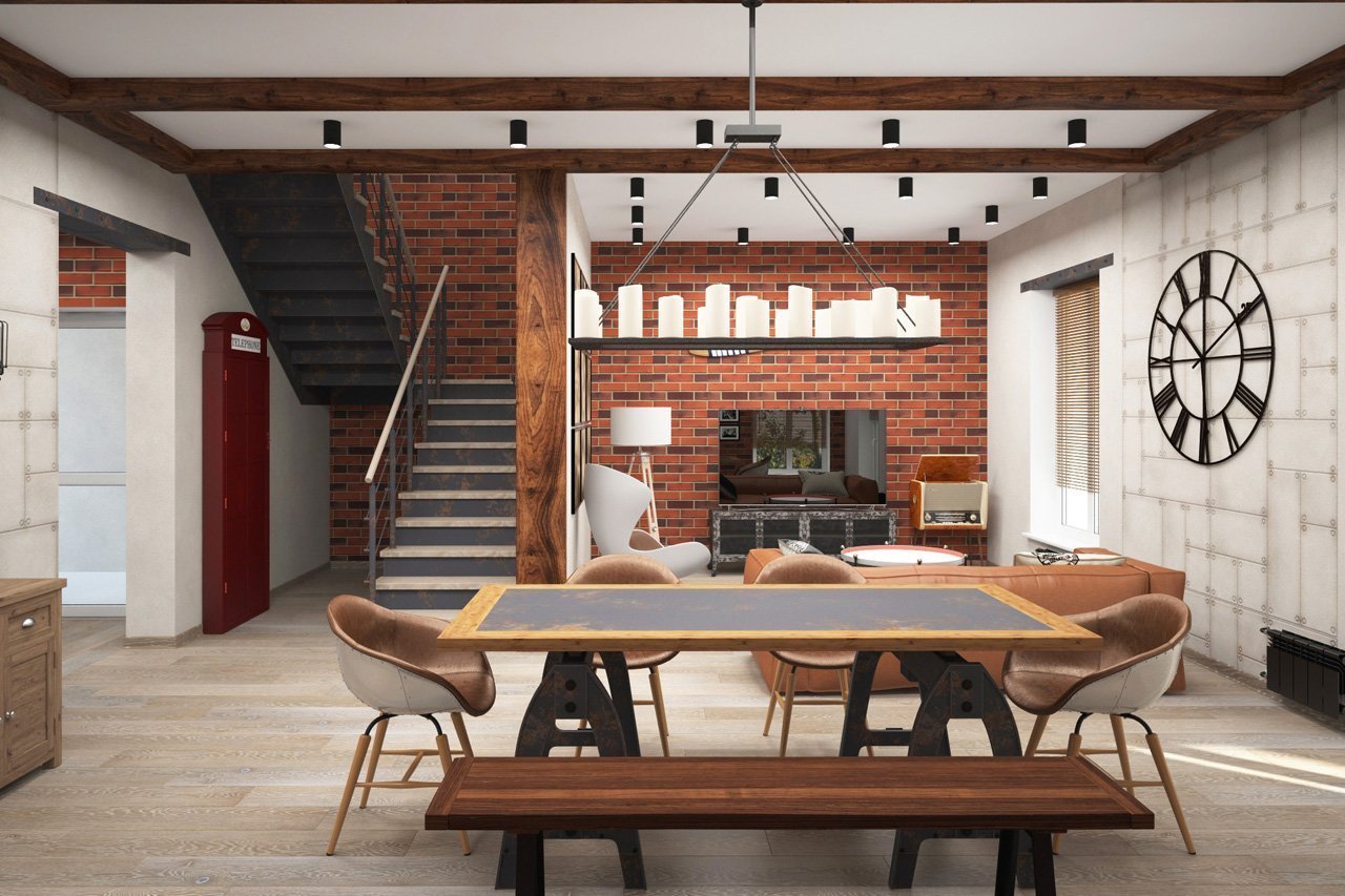 Loft Estilo industrial, caracterizado por grandes espacios, paredes de ladrillo acentuadas, comunicaciones en exhibición y abundante luz artificial.